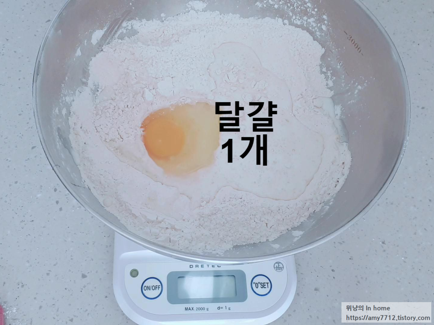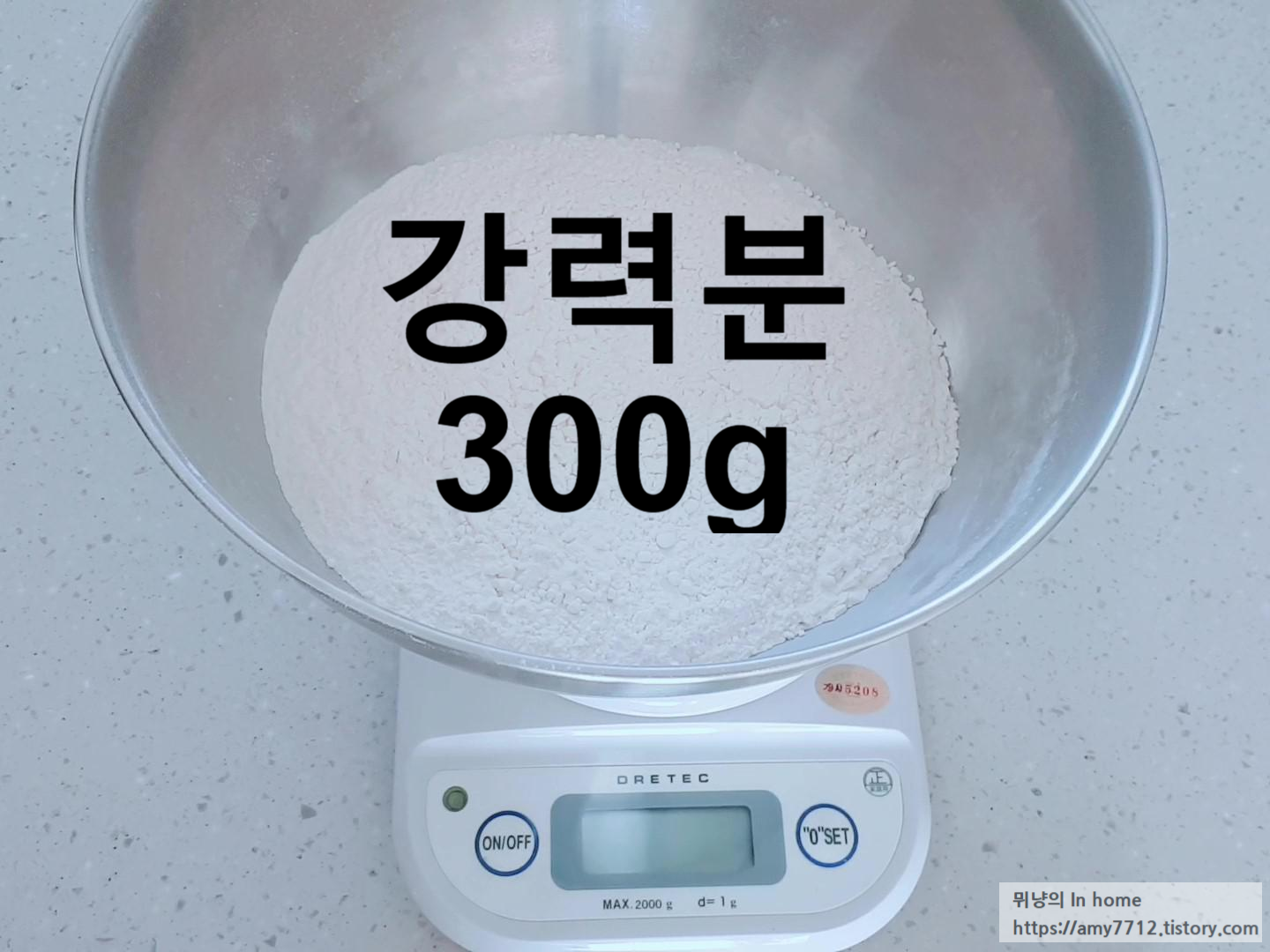 강력분 300g, 설탕 32g, 소금 3g을 넣고 대충 섞어줍니다.