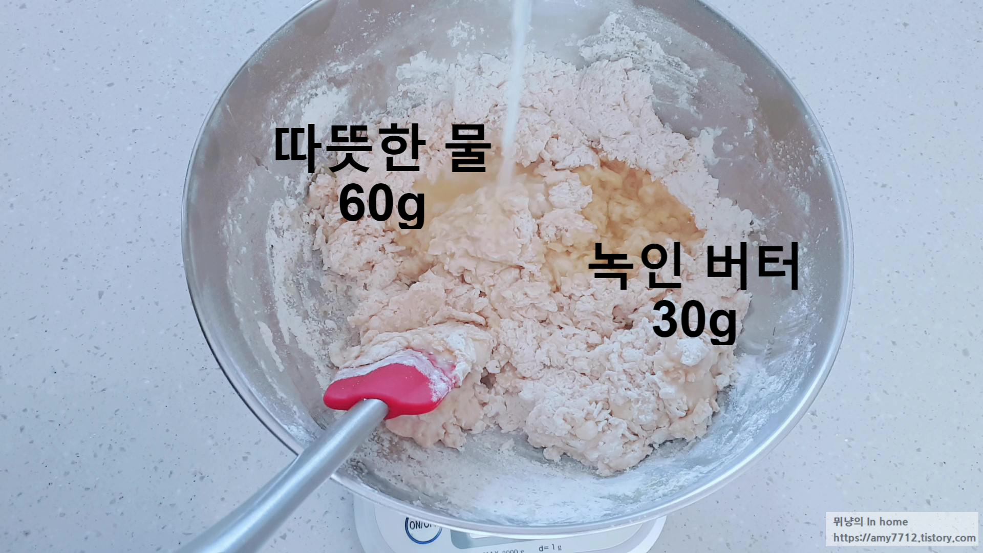 반죽에 따뜻한 물 60g과 녹인 버터 30g을 넣고 가루가 안 보이도록 꼼꼼하게 섞어줍니다.