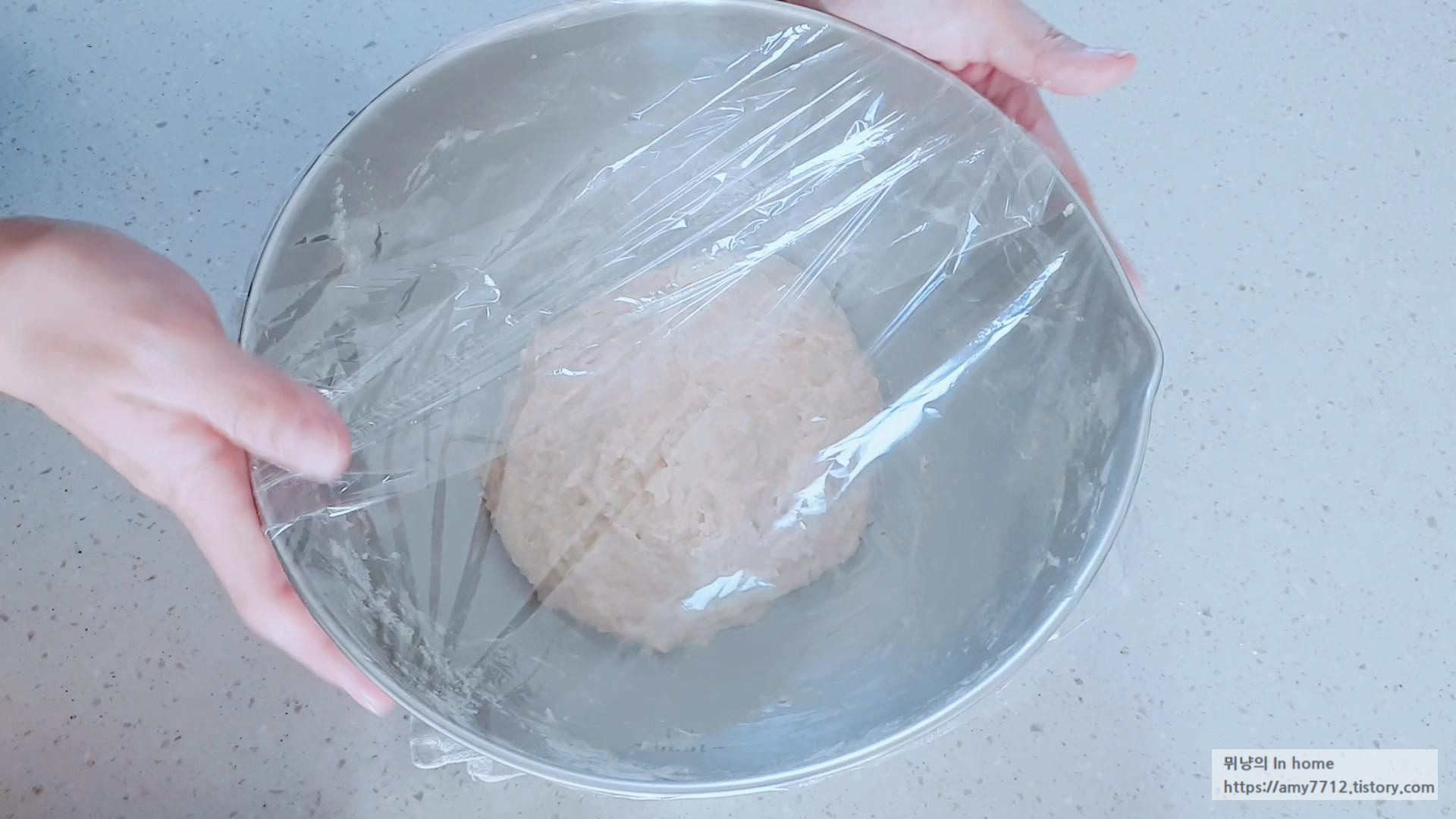 이렇게 완성된 반죽은 랩이나 면보로 덮은 후에 90분 동안 1차 발효를 해줍니다.