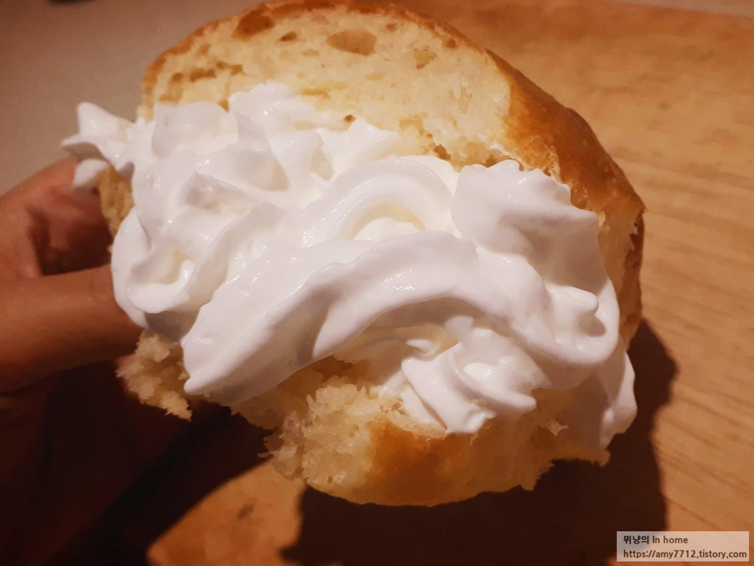 뜨거운 빵을 먹다가 남아서 식은 빵은 이렇게 반을 갈라서 생크림을 쭉 넣어 먹었답니다.