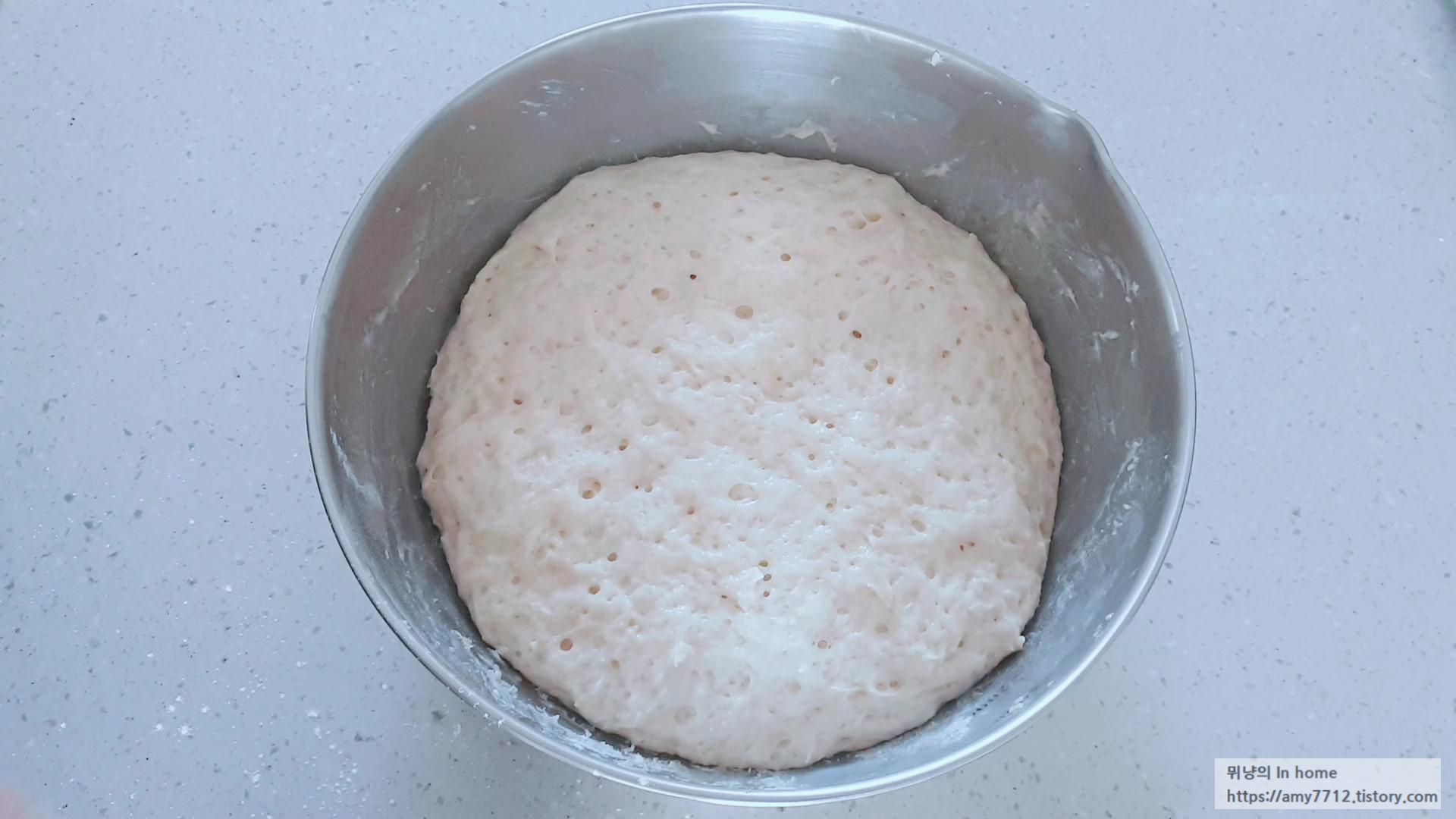 1차 90분 발효가 끝난 상태입니다. 정상적으로 발효가 되었다면, 처음 반죽 크기보다 2-3배 부풀어야 합니다.