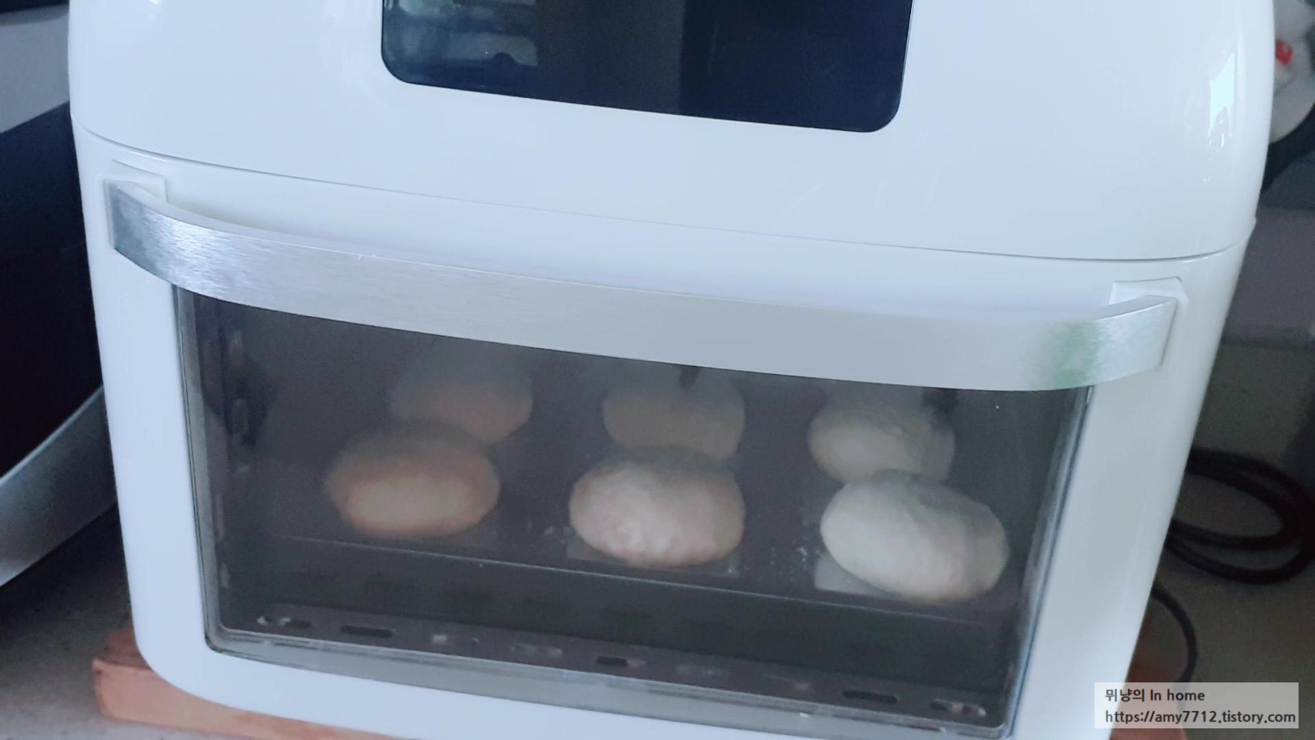 1차 발효 때와 마찬가지로 에어프라이어를 따뜻하게 만들어 준후에 반죽을 넣어 2차 발효를 시켜줍니다. 2차 발효는 45분 동안 해줍니다.