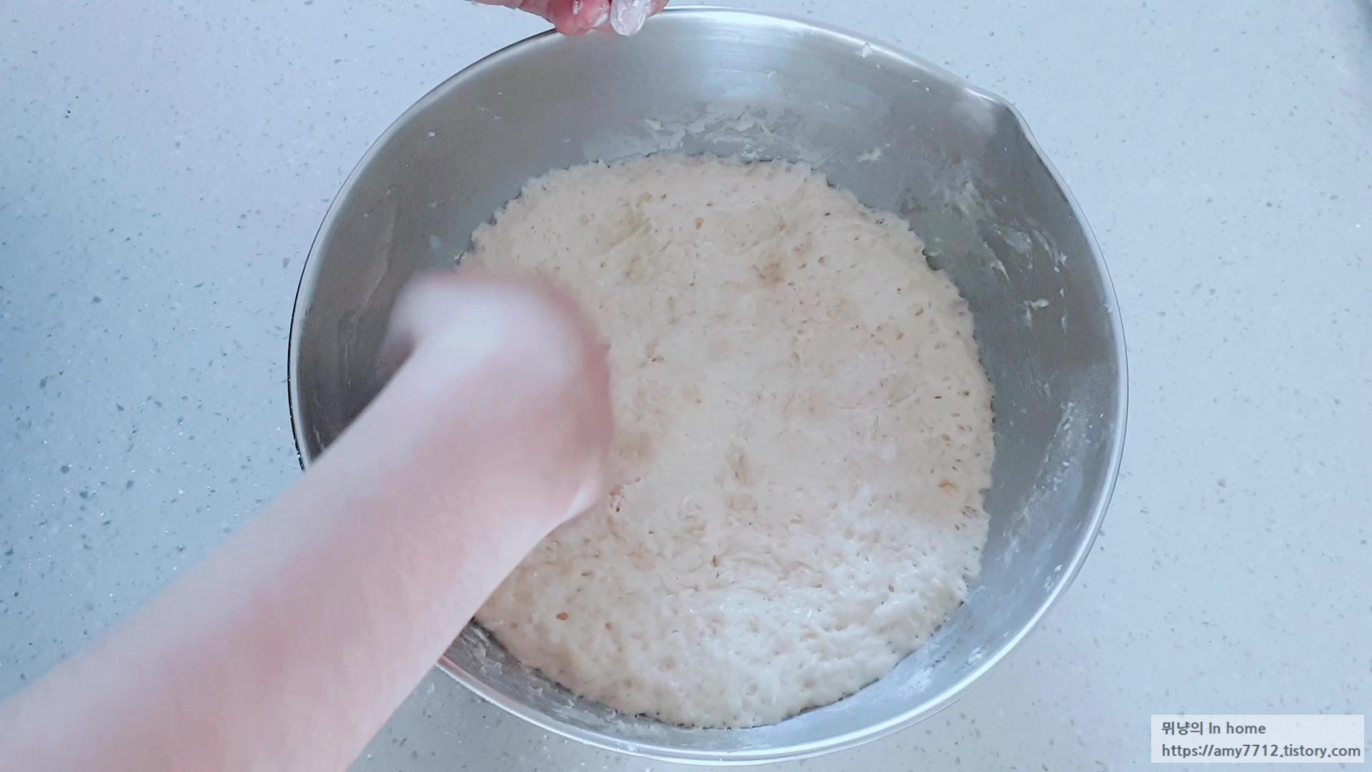 반죽을 꾹꾹 눌러 반죽 안에 있는 가스를 모두 빼줍니다. 이 레시피의 반죽은 수분이 많은 상태입니다. 손에 많이 달라붙어서 다루기 힘들 때에는 덧가루(밀가루)를 손에 묻혀가며 만져줍니다.