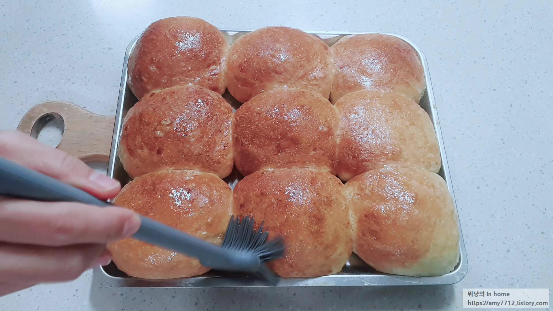 다 구워진 모닝빵입니다. 윤기가 흐르도록 녹인 버터를 윗면에 골고루 발라줍니다.