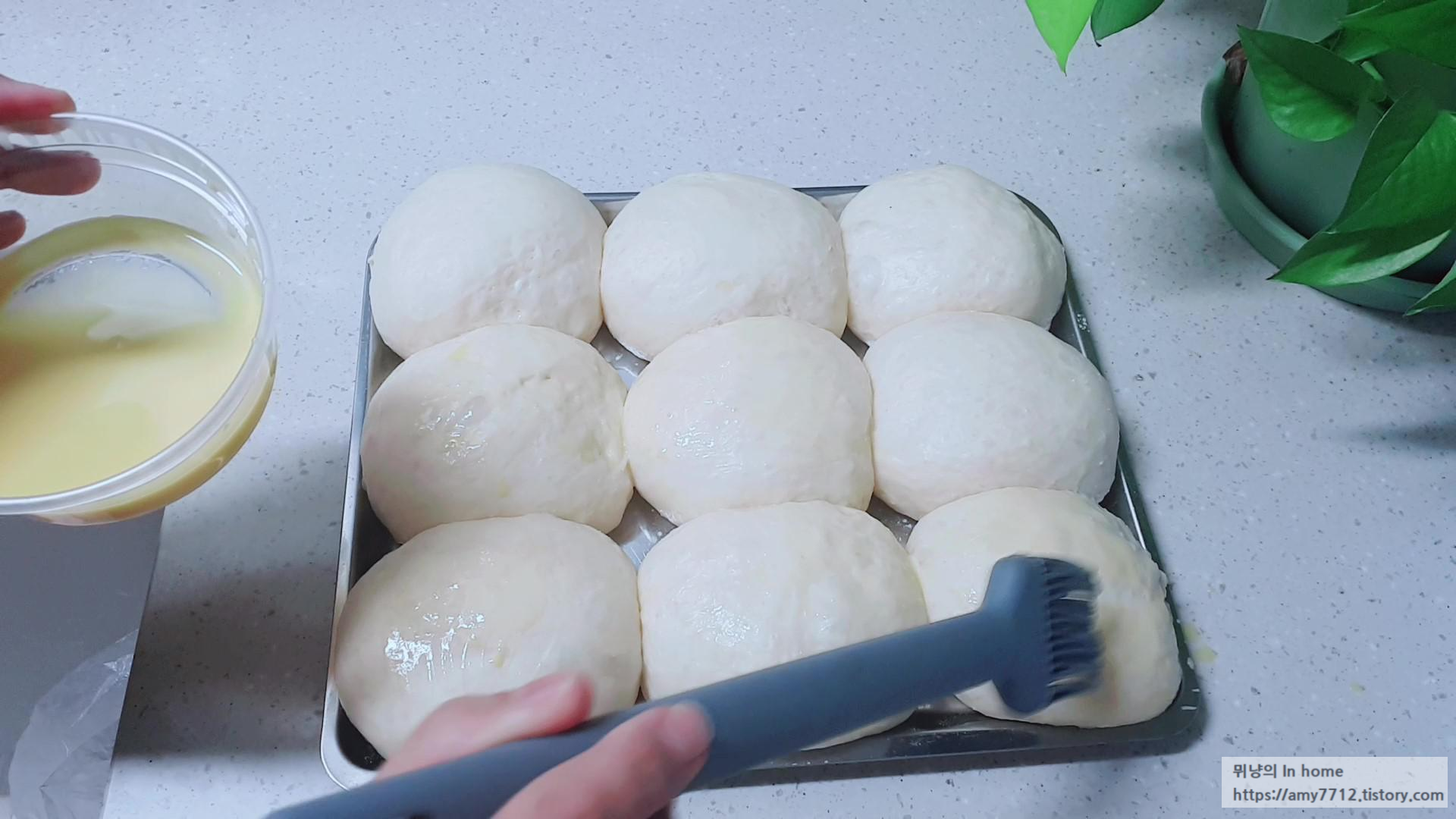 2차 발효가 완료된 반죽은 달걀물(달걀노른자 1: 물 3)을 윗면에 발라줍니다. 이 작업을 해주면 빵의 윗면의 색이 잘 나옵니다.