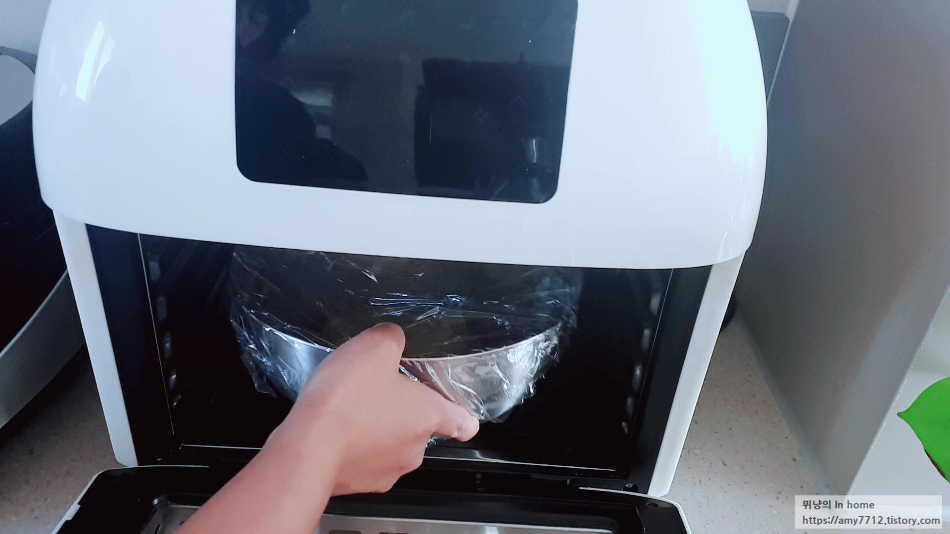 랩으로 덮은 반죽을 따뜻하게 데워진 에어프라이어에 넣어 발효를 시켰습니다. 이때 에어프라이어를 가동하지는 않습니다. 데워진 온도만 가지고 충분히 발효가 됩니다.