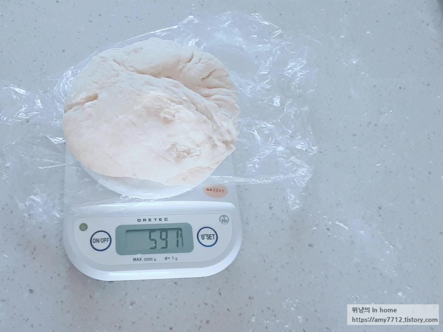 총반죽의 무게는 591g입니다. 이 반죽을 나누어 9등분 해줍니다.
