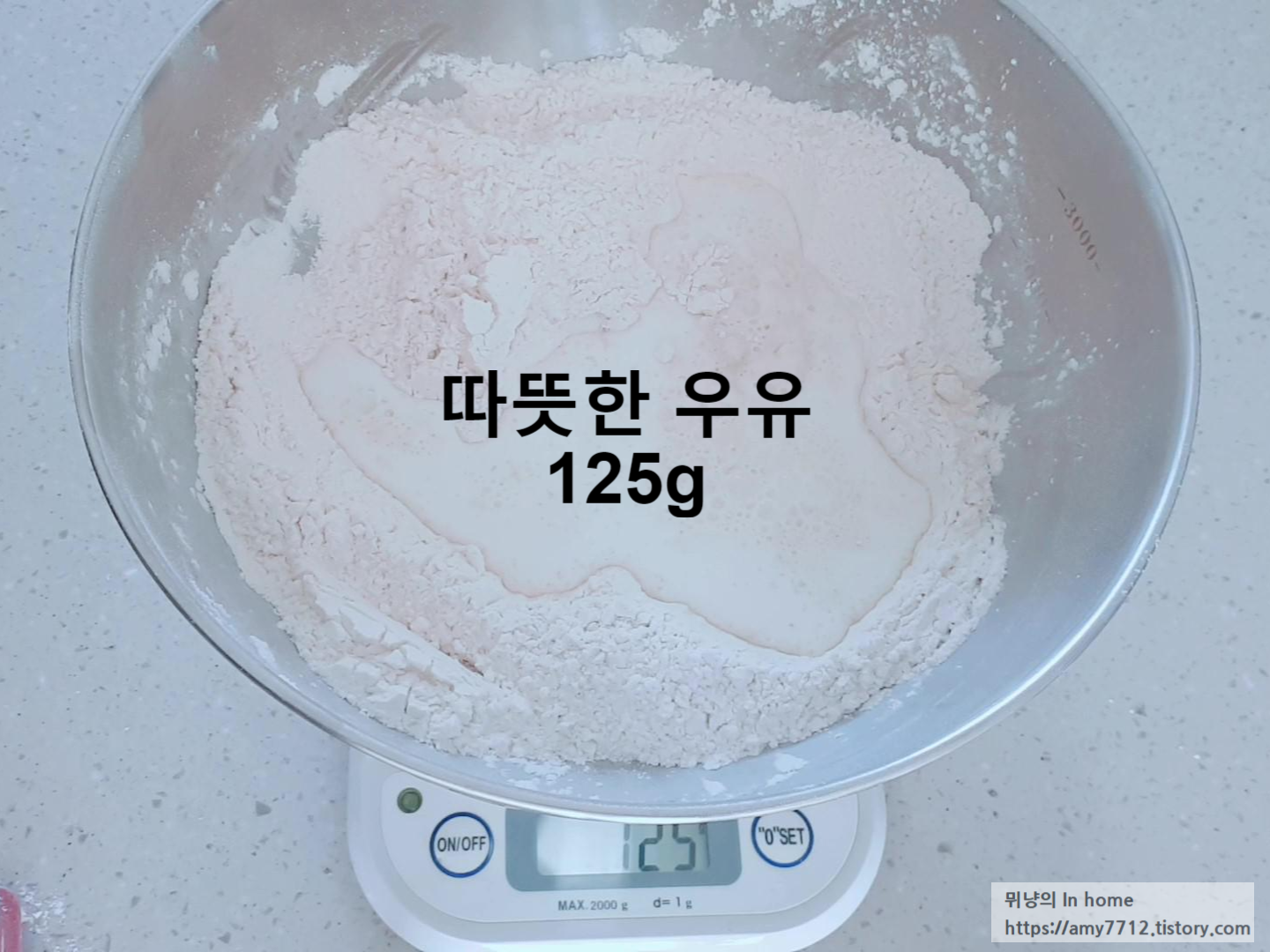 인스턴트 드라이 이스트 5g, 따뜻한 우유 125g, 달걀 1개를 넣고 대충 섞어줍니다.