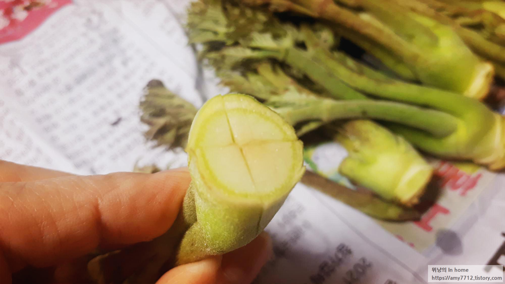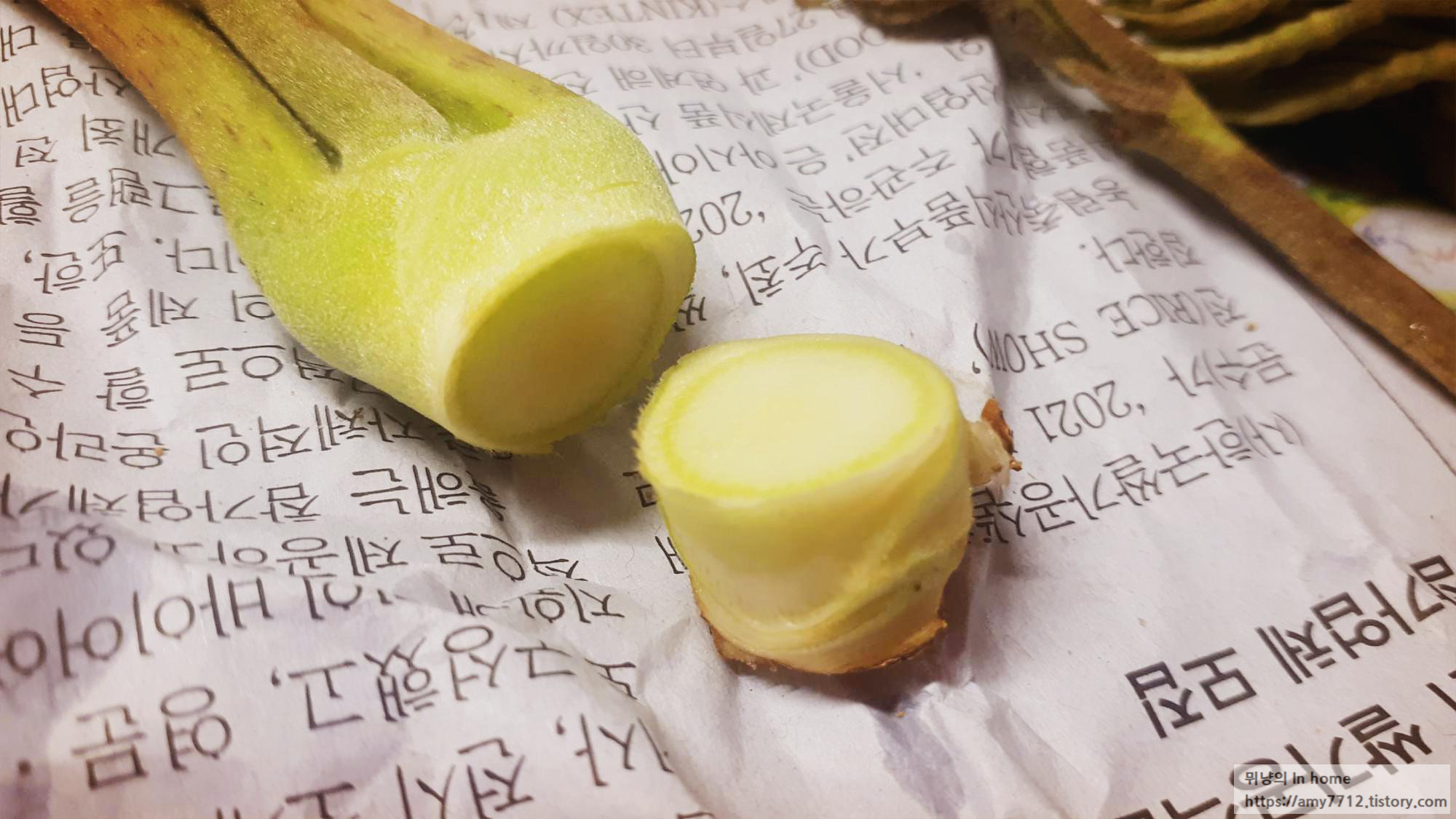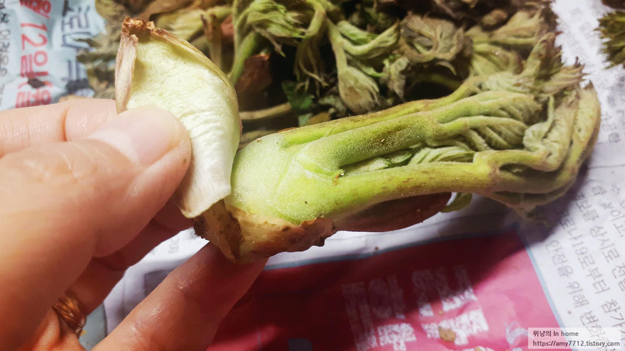 밑동 부분에 감싸 져 있는 껍질을 제거해 줍니다. 손으로 떼어내도 잘 떨어집니다.