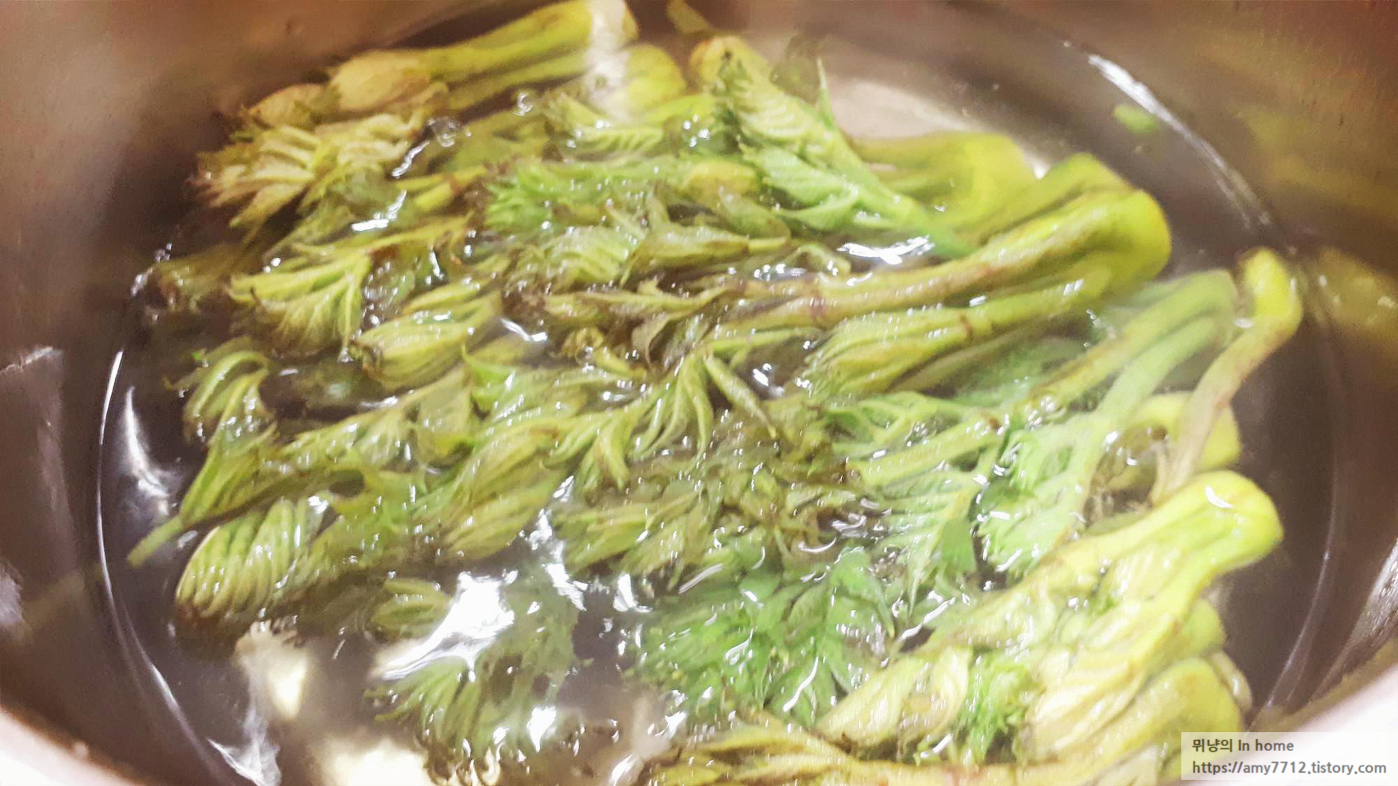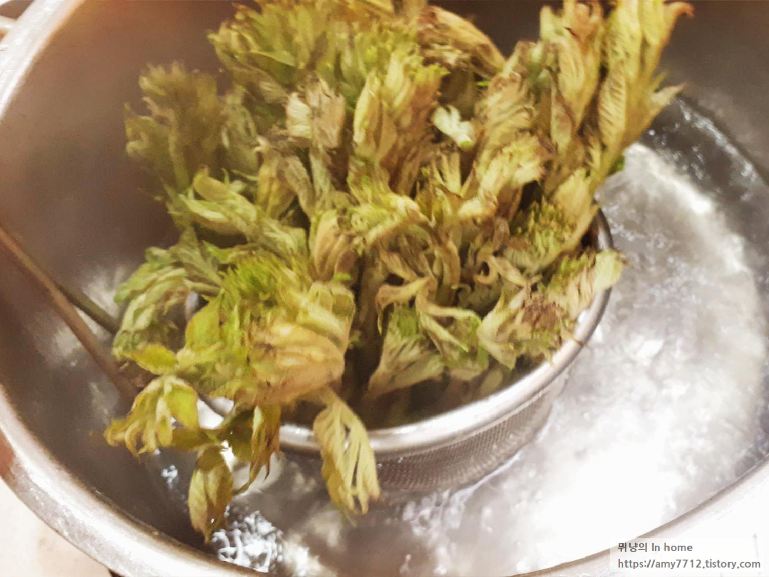 체망이 있어서 활용을 했더니 정말 좋습니다! 체망이 없다면 고무장갑을 끼시고 손으로 잡아 밑동부터 데쳐주시면 됩니다.