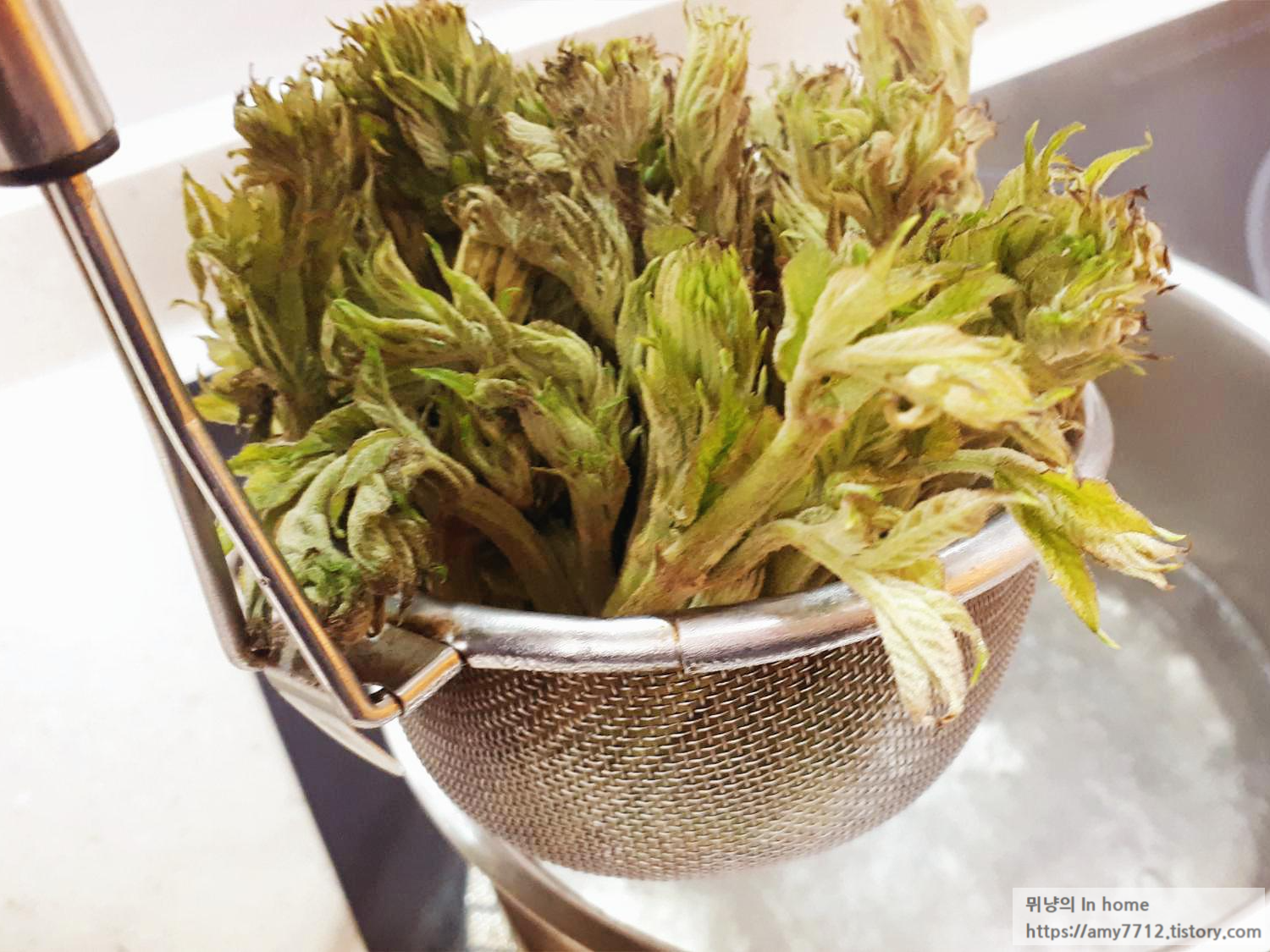 손질이 끝난 두릅은 물에 담근 후, 잎 부분을 잘 흔들어 이물질이 떨어질 수 있도록 세척해줍니다.
