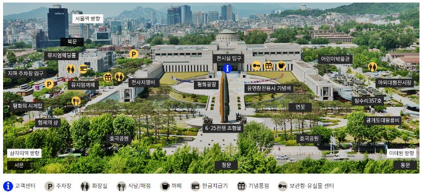대중교통을 이용하신다면 6호선 삼각지역 12번 출구로 나오셔서 200미터 정도 걸으시면, 전쟁기념관 정문으로 입장하실 수 있습니다.
