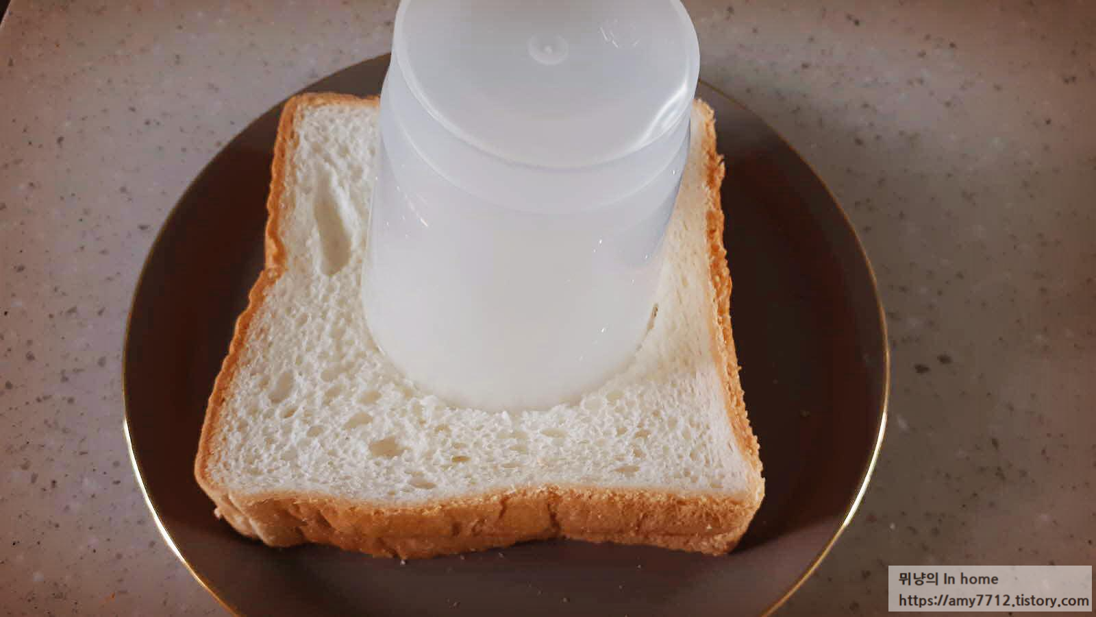 식빵 2장 중 1장에 동그란 컵으로 구멍을 만들어 주세요.