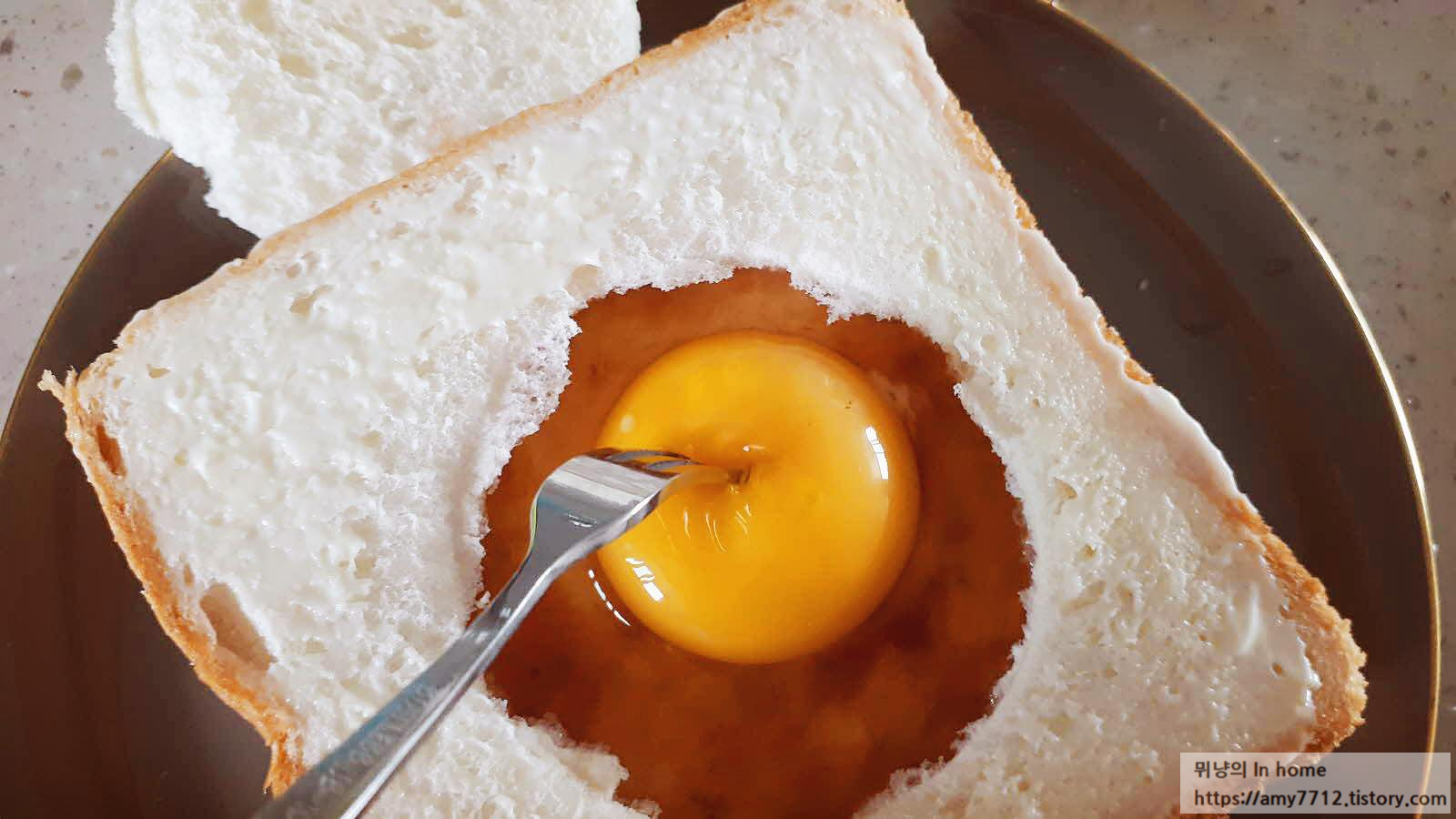 식빵 구멍 안에 달걀도 예쁘게 자리 잡혀 구워졌고요.