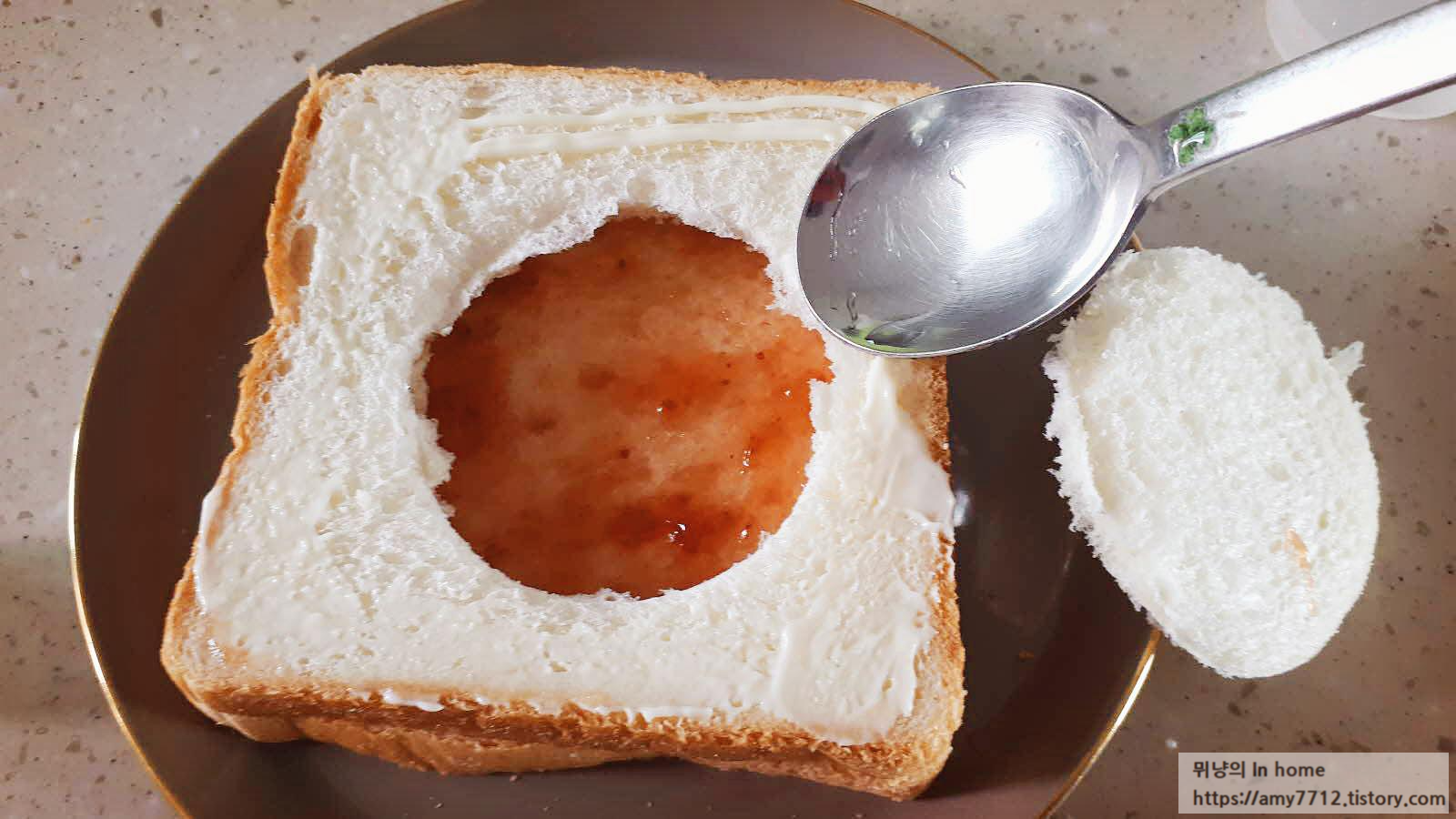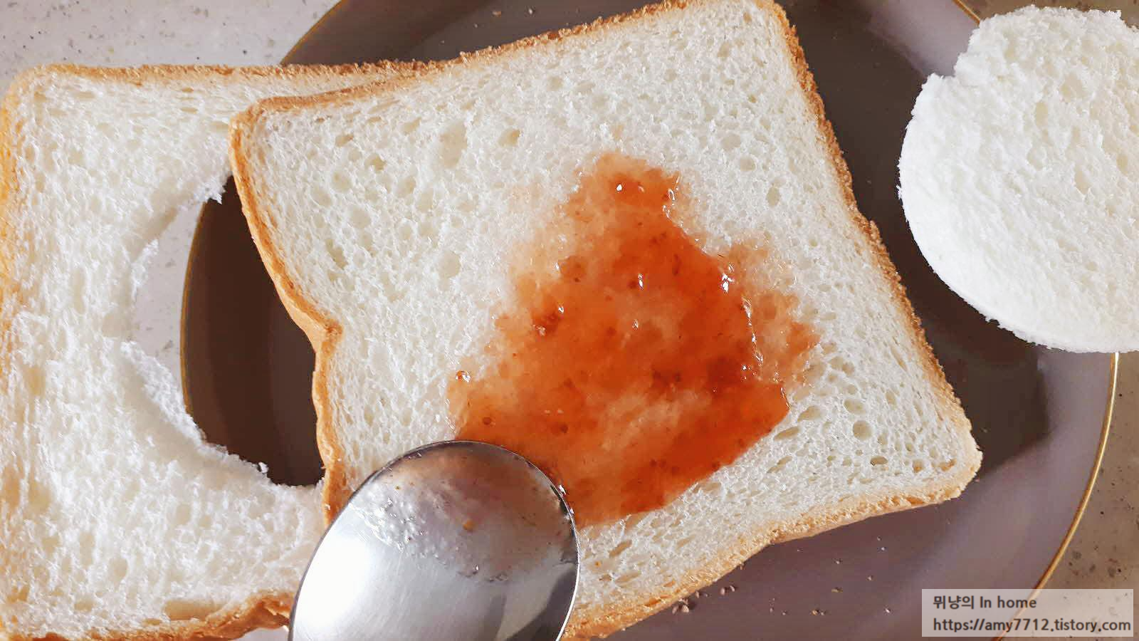 딸기잼 바른 식빵 위에 구멍 난 식빵을 올려주세요.
