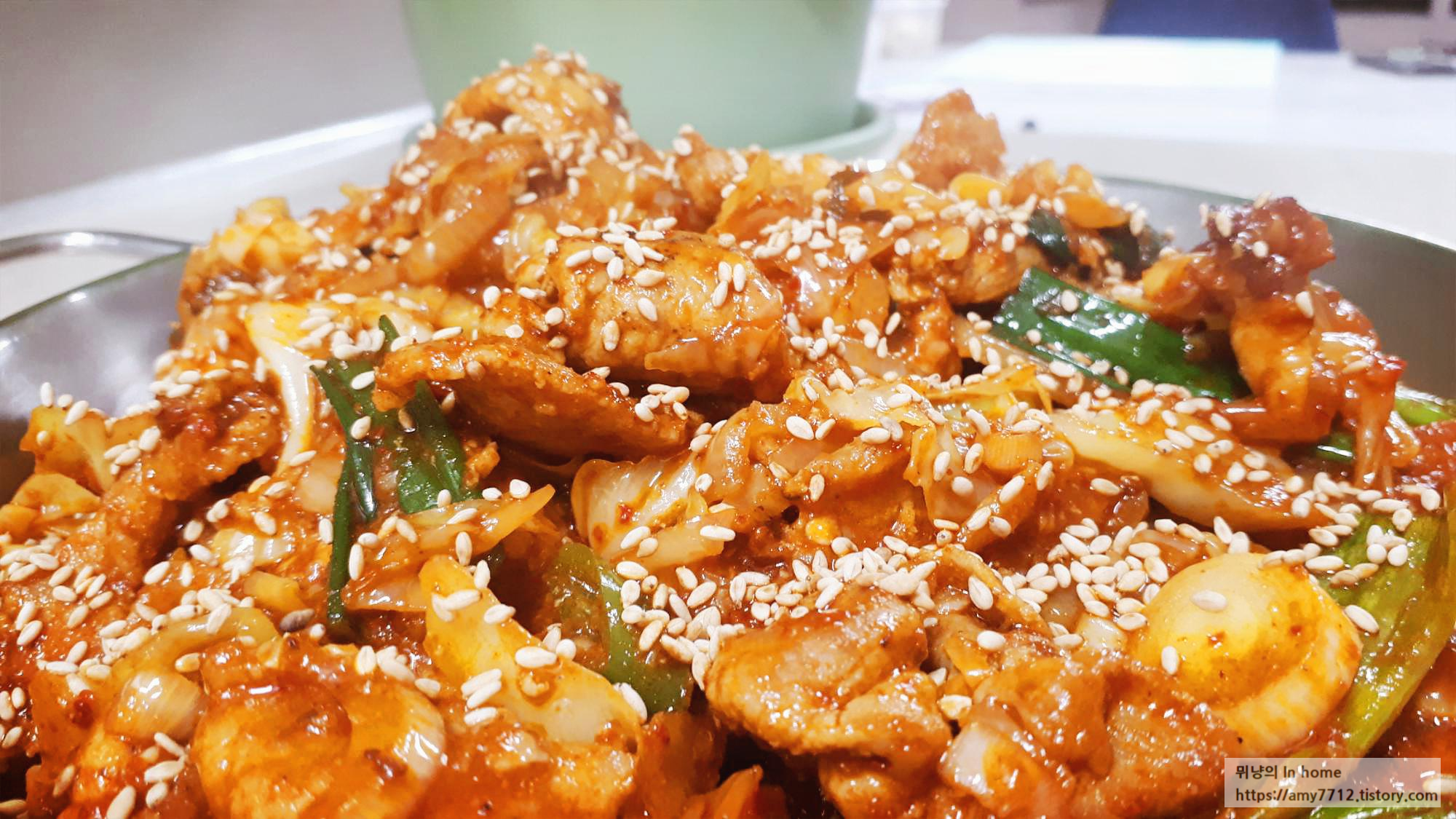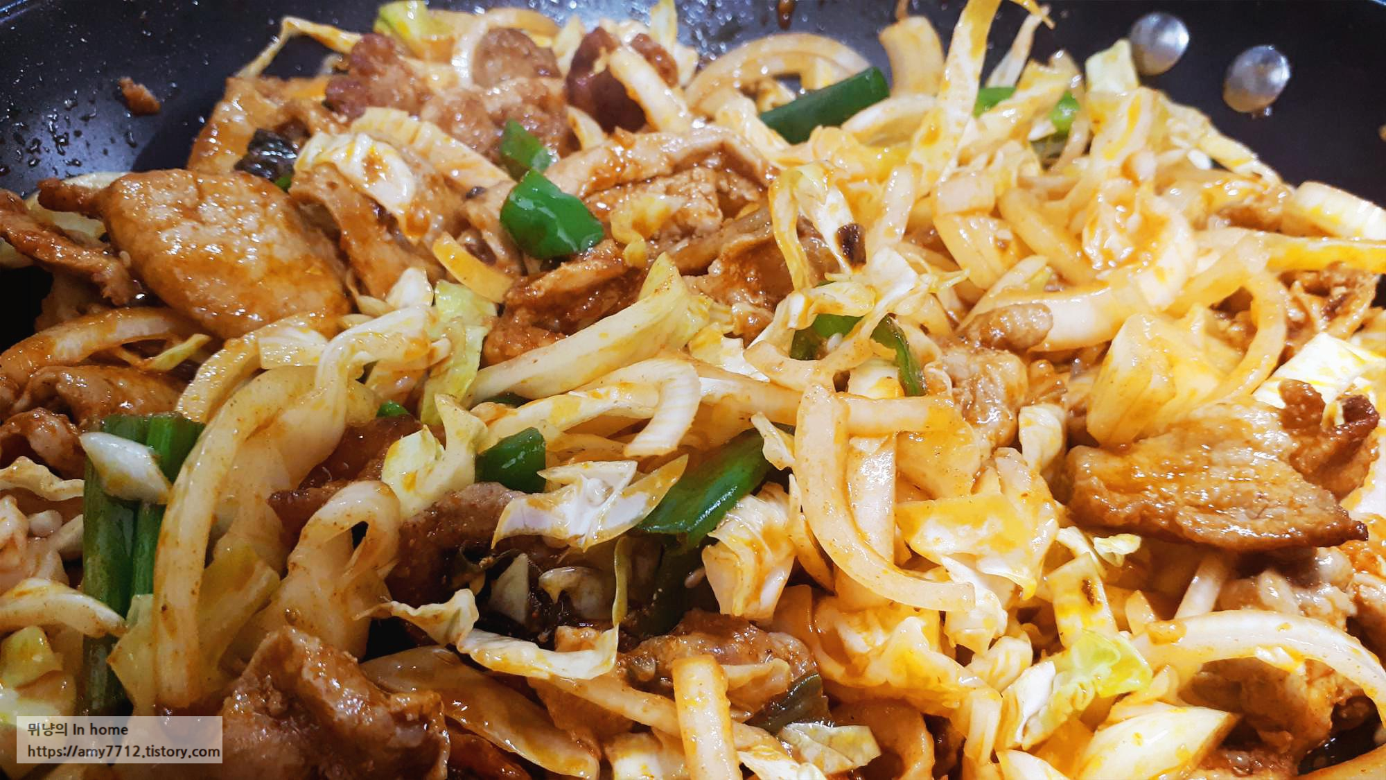 | 조리과정 | 1. 양파 1/2개, 양배추 1/4통, 대파2대, 청양고추 3개, 당근 1/3개(생략가능)를 썰어서 준비합니다. 2. 물 반컵에 고추장 1큰술, 마늘1큰술, 간장 2큰술을 넣은후, 잘 섞어줍니다. (양념장 완성) 3. 예열된 팬에 식용류 5숟갈을 넣고, 강불에 파한줌을 넣어 파기름을 내어줍니다. 4. 준비된 고기를 파기름에 넣어 노릇노릇 볶아줍니다. 5. 설탕 1-2큰술을 넣어줍니다. 6. 2번에서 준비한 양념장을 넣고, 약불로 줄입니다. 7. 국물이 어느정도 줄었을때, 양배추,양파를 넣습니다. 8. 채소가 적당히 볶아지면, 고춧가루 1큰술과 남은 파를 넣습니다. 9. 참기름 1큰술, 후춧가루 톡톡 넣습니다. 10. 주걱으로 잘 섞어주면, 완성입니다. |