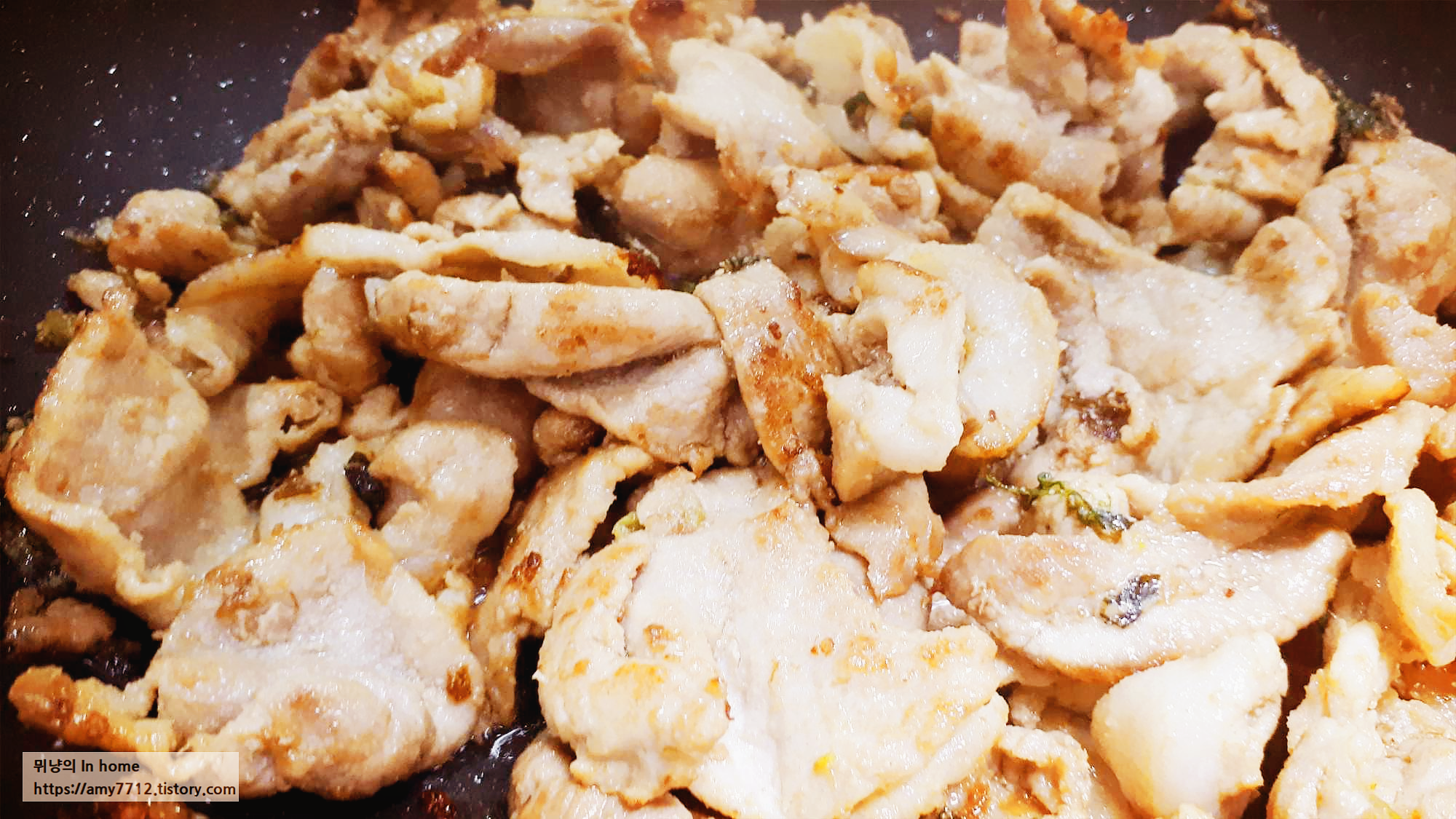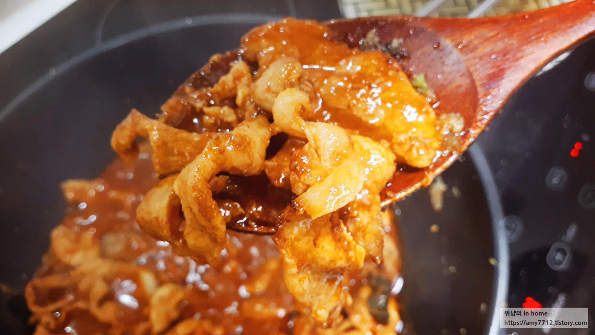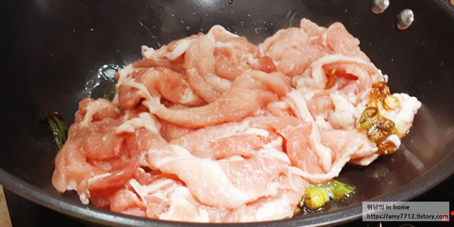 돼지고기는 불고기용으로 얇게 썰어진 고기로 준비합니다. 종이컵으로 2컵 정도 준비하시면 300-350g 정도 됩니다. 고기는 저렴한 뒷다리살도 괜찮습니다. 앞다리 살보다 뒷다리살이 기름이 적습니다. 저는 뒷다리살로 구매했습니다. 드시는 분이 선호하는 고기부위대로 선택하시면 될 것 같습니다. 준비된 고기를 파 기름에 넣고 볶아주세요. 노릇노릇 튀기듯이 볶아주어야 맛있습니다. 냉동된 고기라면 반드시 해동후 사용해주셔야 고기 잡내가 나지 않습니다.
