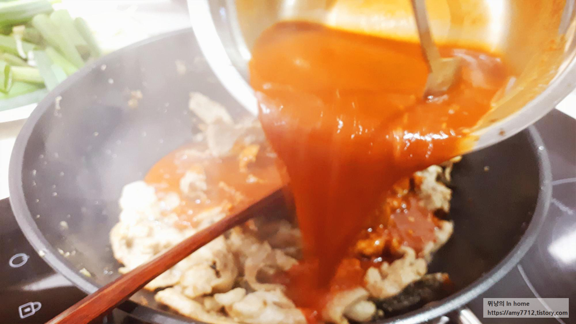 고기가 노릇노릇 볶아졌다면, 준비된 양념장을 넣고 약불로 줄여 줍니다.
