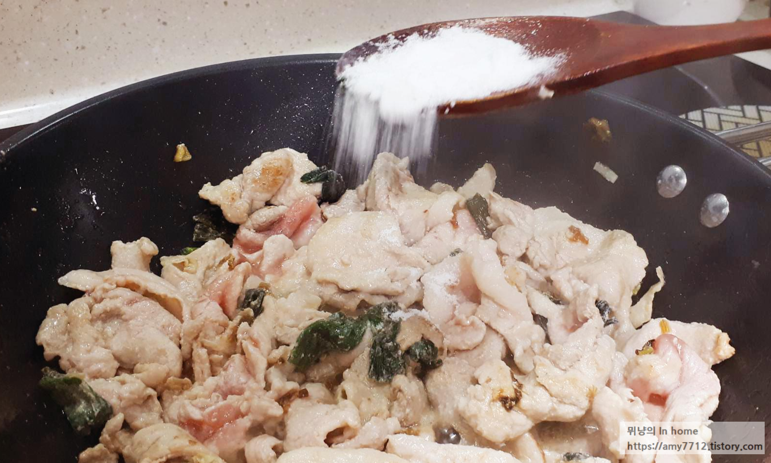 어느 정도 고기가 익어, 하얗게 변했을 때, 설탕 1-2큰술을 넣어줍니다. 기름에 설탕이 볶아져야 풍미가 살아나니 기름 쪽에 넣고 볶아주세요.