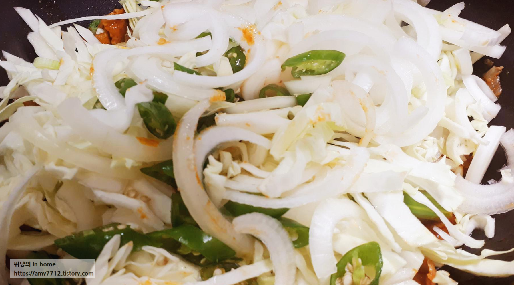썰어놓은 양배추, 양파, 청양고추를 넣고, 잘 볶아줍니다.