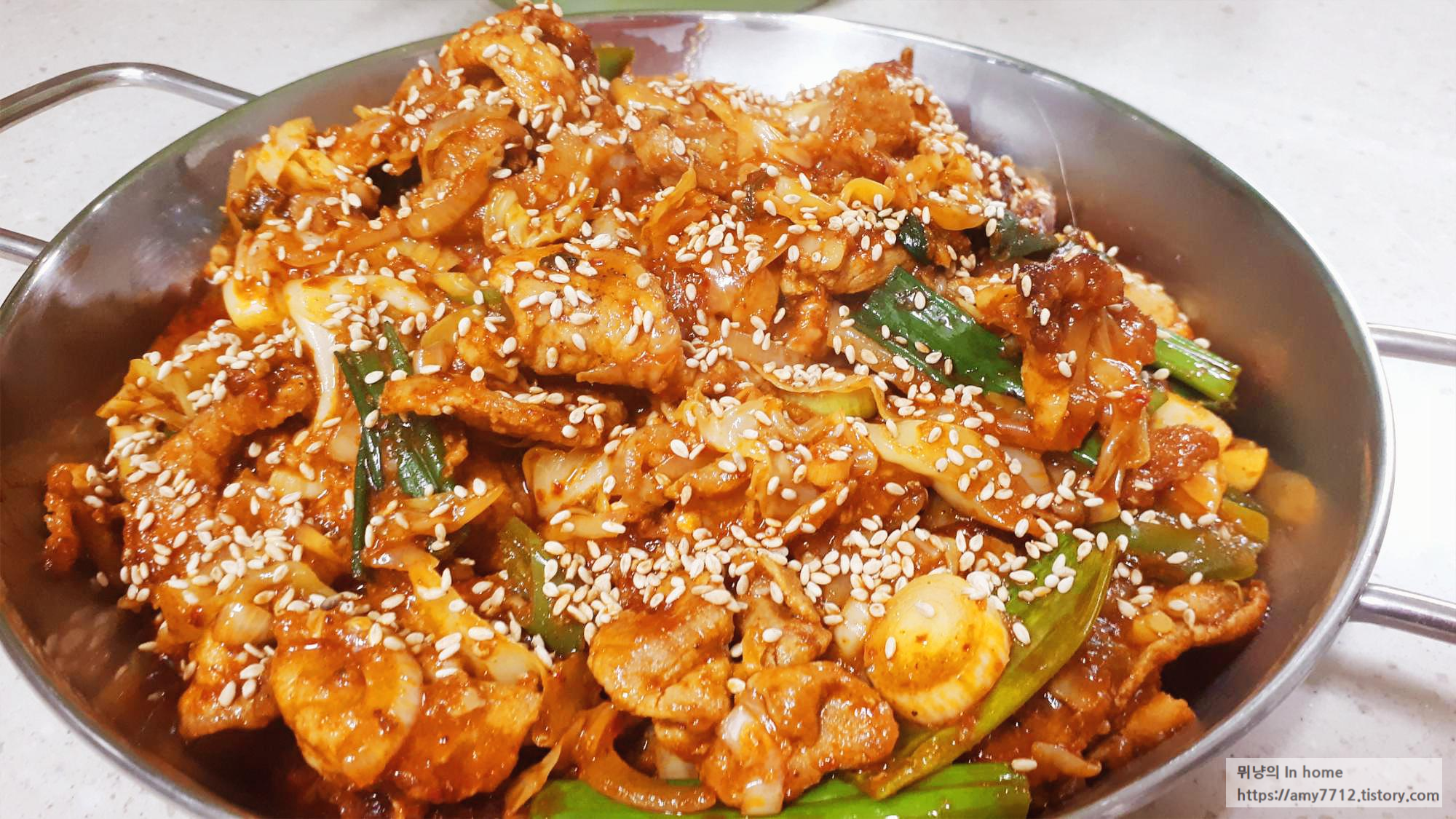 밥 위에 척 올려서 먹으니 정말 맛있습니다. 집에서 만들던 제육볶음하고는 차이가 있었습니다. 술안주로도 좋을것같은 맛이었습니다. 사진을 보면서 후기를 올리는데에도 침이 계속 고이네요. ^^ 젓가락으로 한점씩 집어서 먹는 것보다 숟가락으로 푹 떠서 밥위에 올리고 밥과 같이 숟가락으로 들어 올려 드시면 더욱더 맛있습니다. 양념과 야채와 고기가 동시에 한입으로 들어와서 입안에서 춤을 추네요!! 정말 맛있게 잘 먹었습니다.