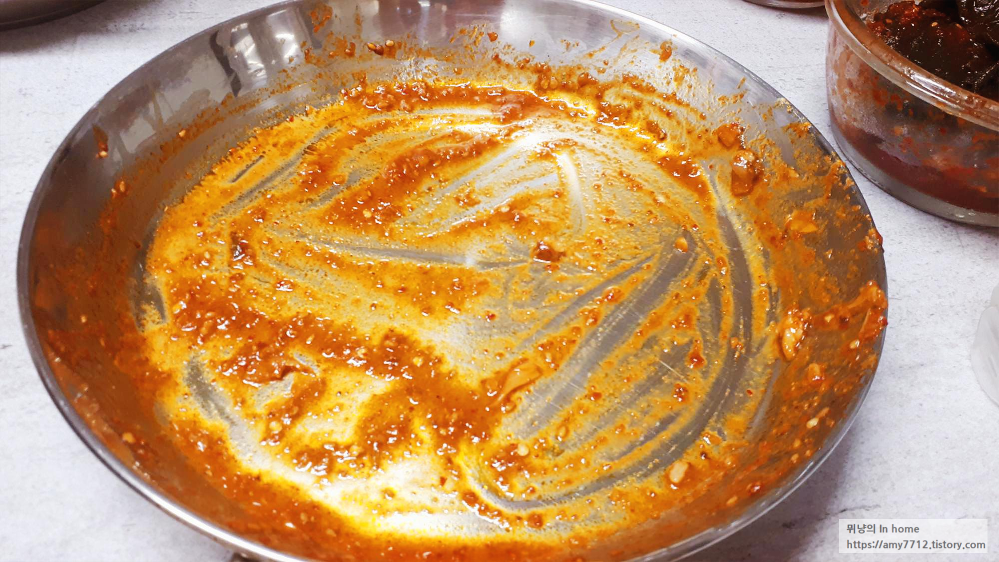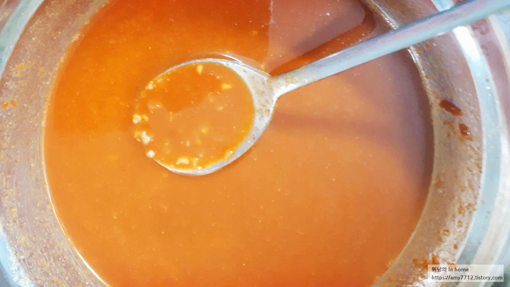 양념장은 간단합니다. 물 반 컵에 고추장 크게~ 1큰술, 마늘 1큰술, 간장 2큰술을 넣어서 잘 섞어 풀어줍니다. 양념장 준비가 끝났습니다. 정말 간단해서 좋습니다!