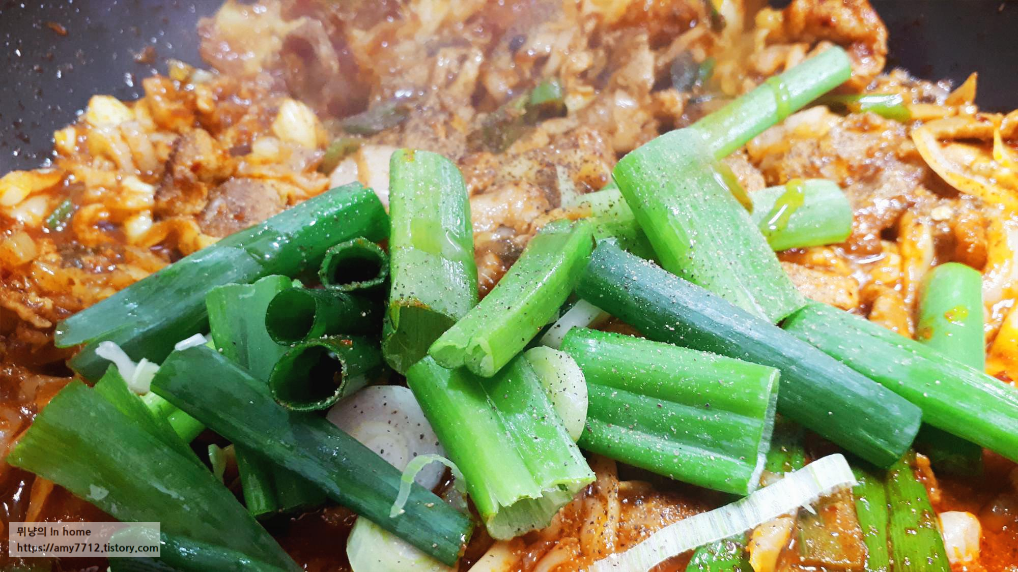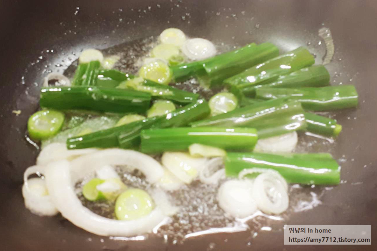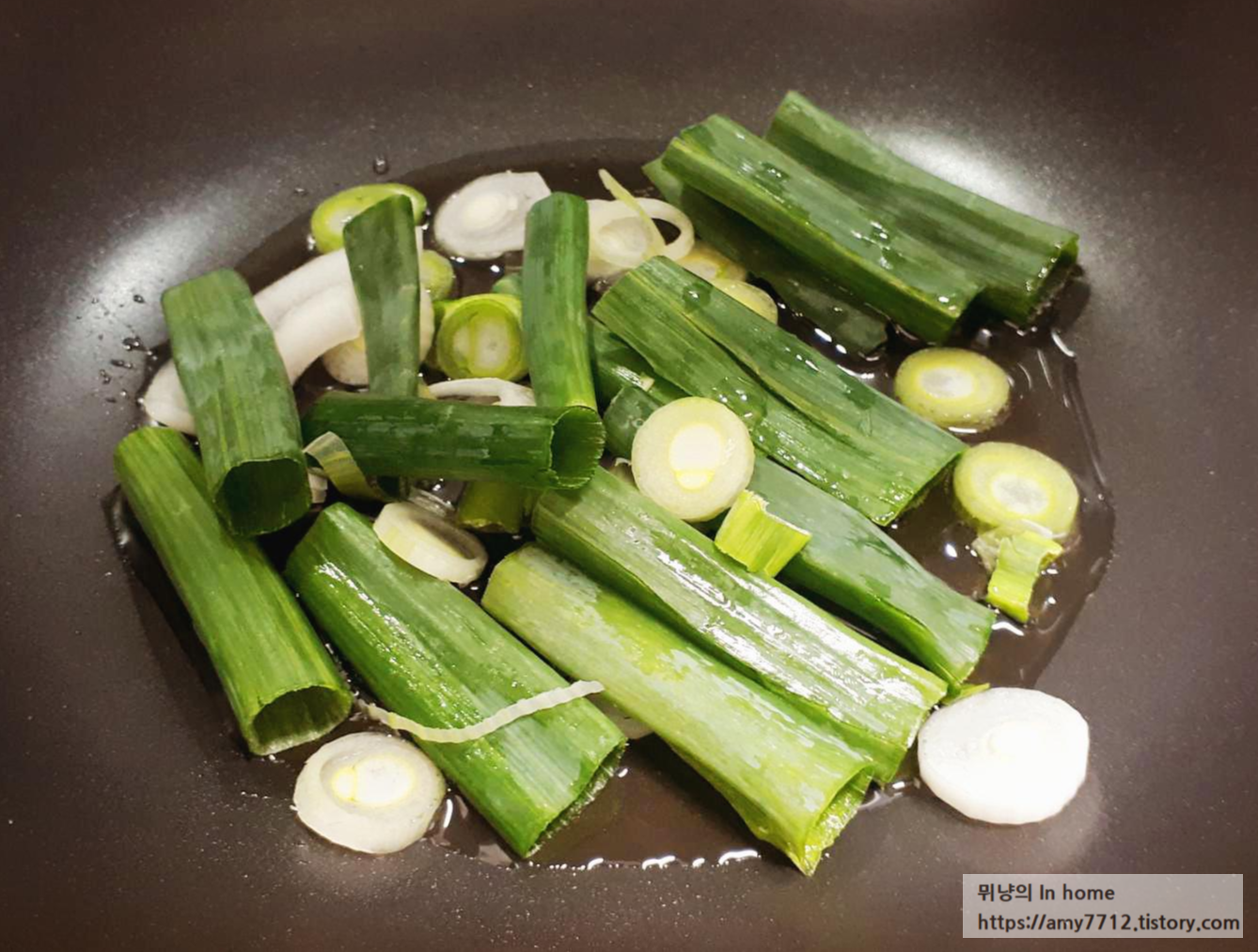 달궈진 팬에 식용유 5큰술을 넣습니다. 식용유는 올리브유 빼고 다 가능합니다. 강불에 파를 한 줌 넣고, 파 기름을 내어줍니다. 썰어놓은 파를 다 쓰지 말고, 한줌정도만 사용해주세요. 남은 파는 마지막에 사용합니다. 파기름을 내니, 부침개향이 나네요~ 침이 고입니다. ^^ 제육볶음의 완성도를 위해 파기름 내는 과정은 꼭 추천합니다!