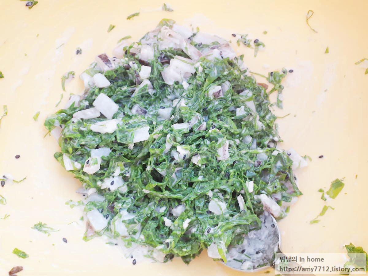 반죽이 담긴 볼에 세척한 파래를 넣고,
