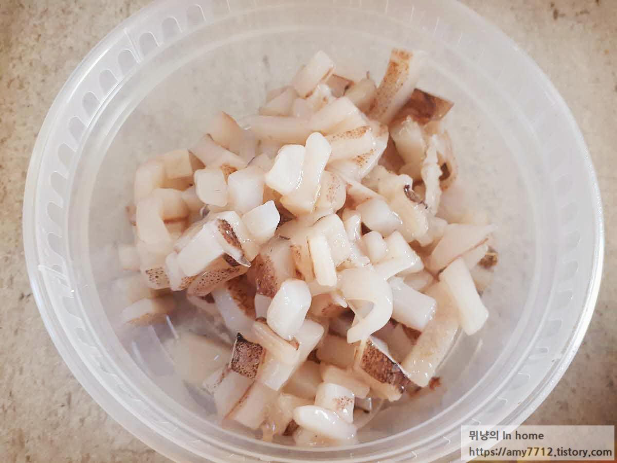 냉동실에 있던 오징어를 해동시켜 잘게 잘라 준비했어요.