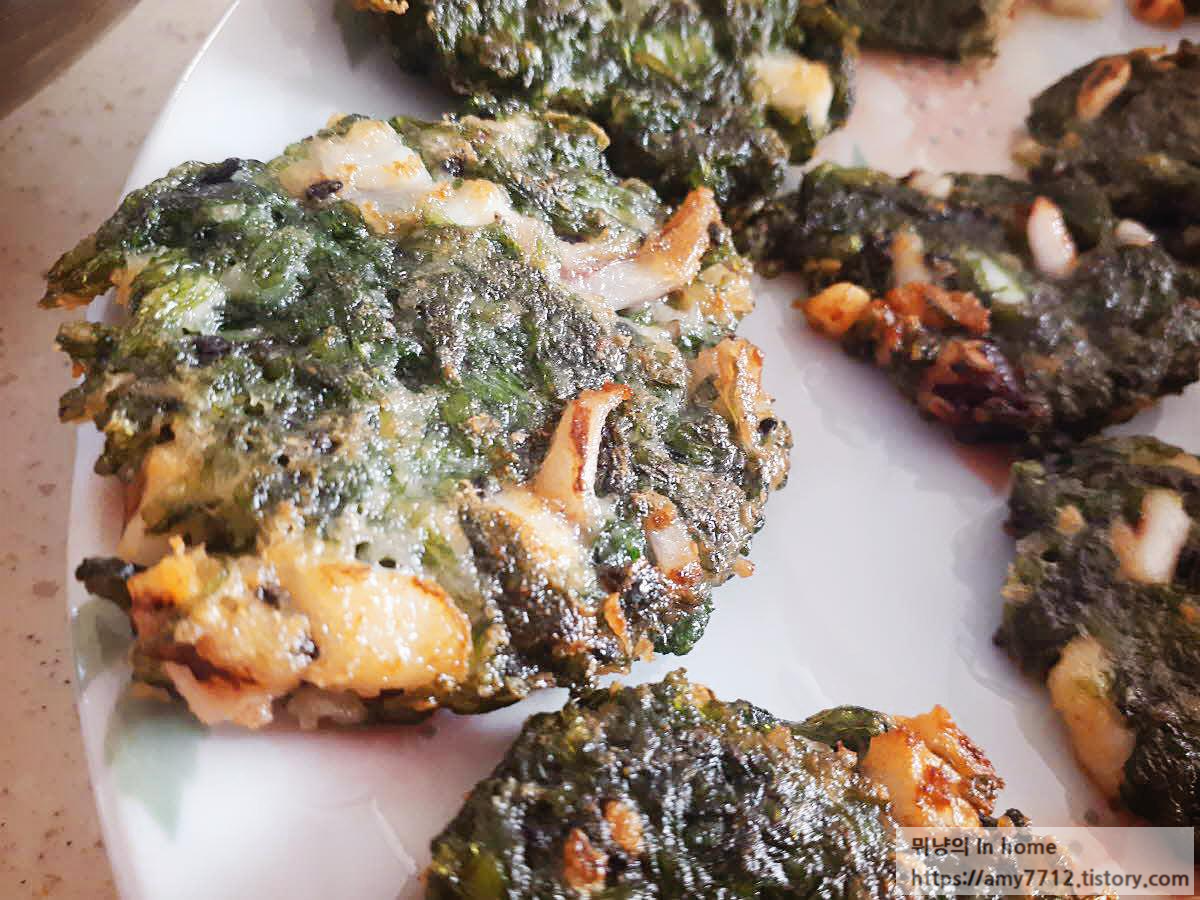 파래전의 첫 식감은 바삭하고, 다음은 쫀득해요.