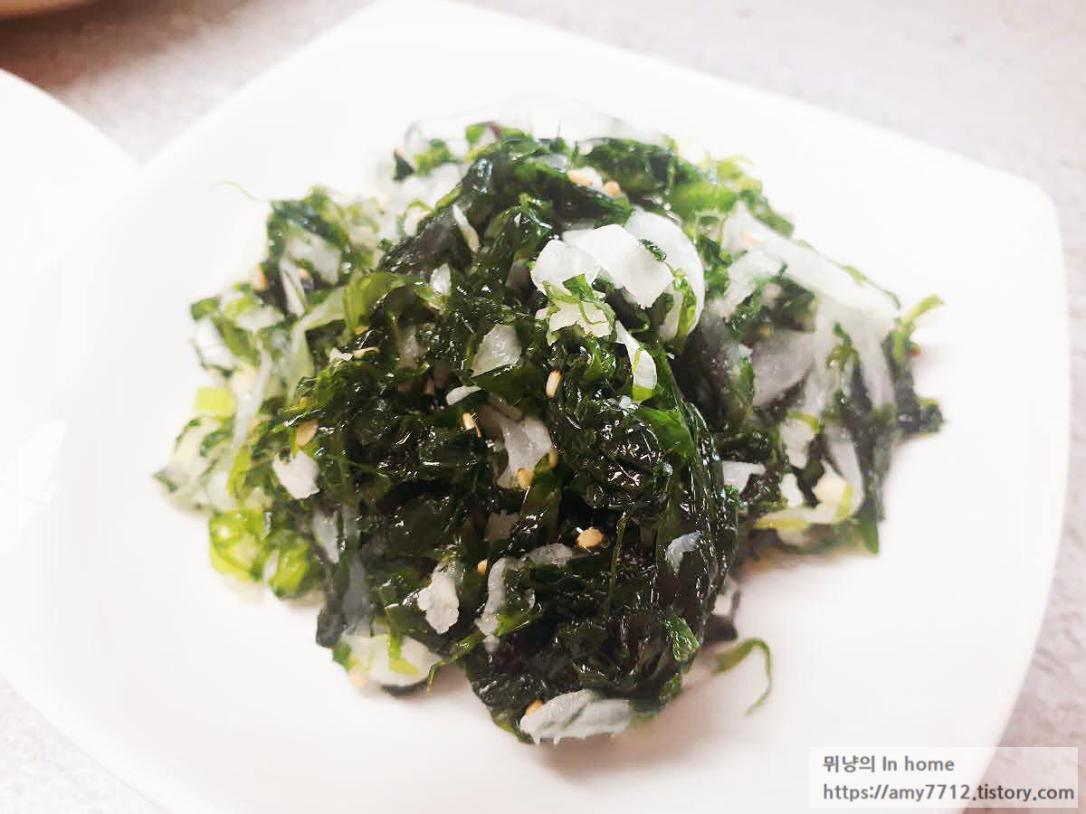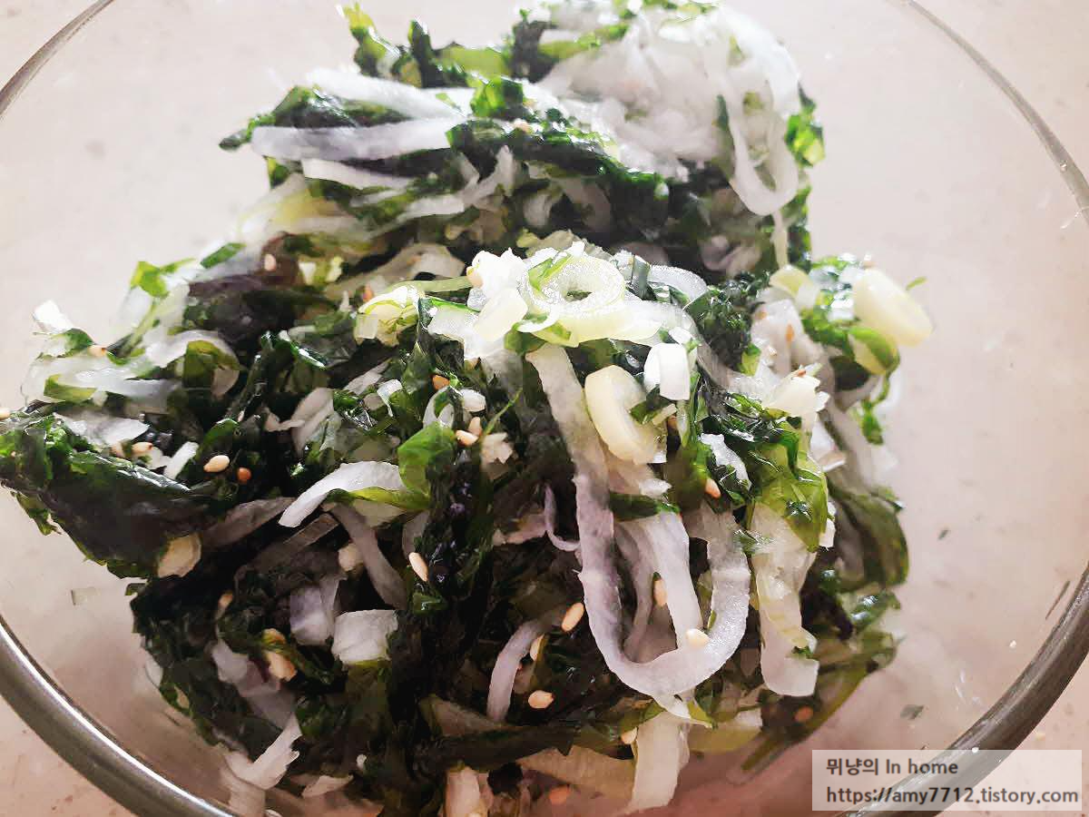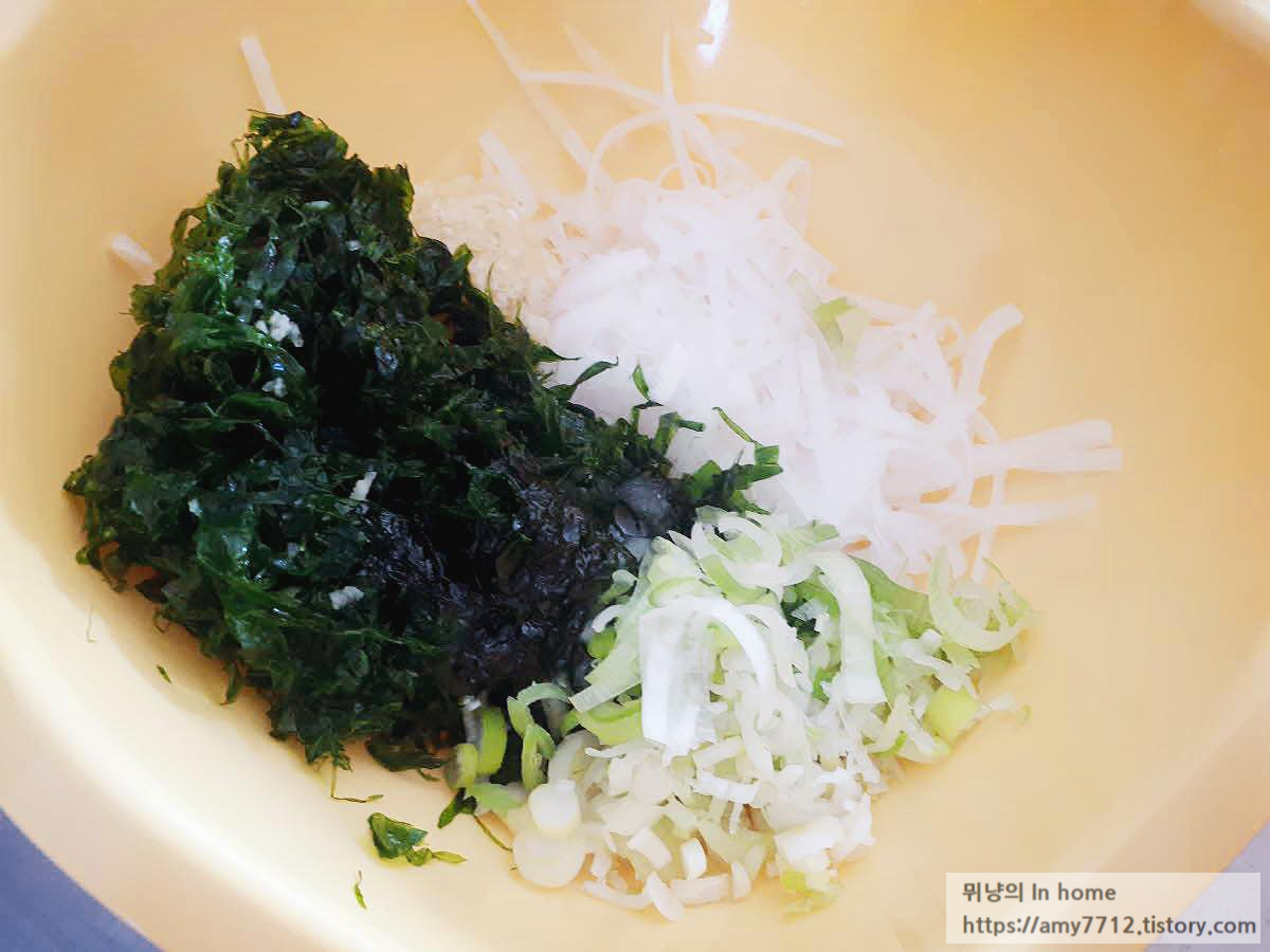 두 덩이는 무채를 넣어 파래무침을 만들었어요.