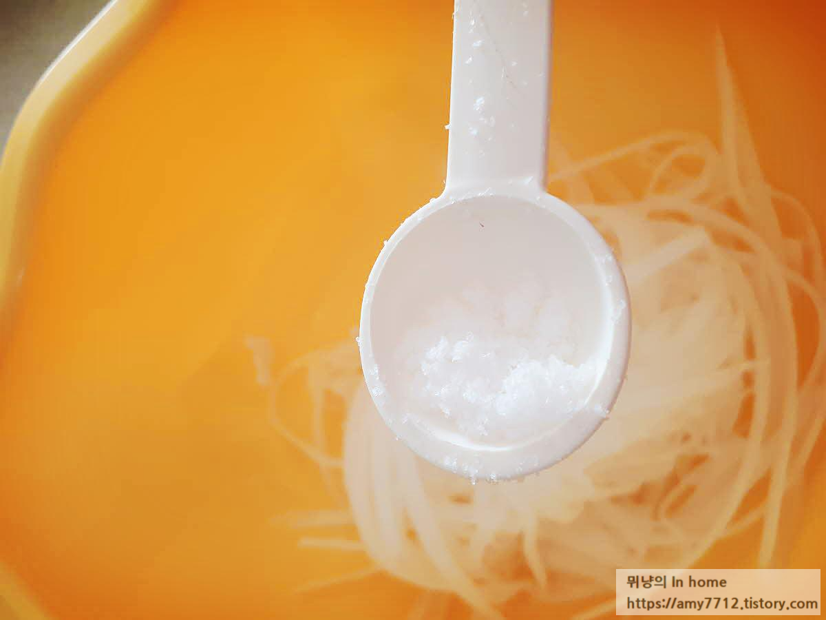 채 썬 무와 잘 버무려 준 후, 10분 정도 절여 주어요.