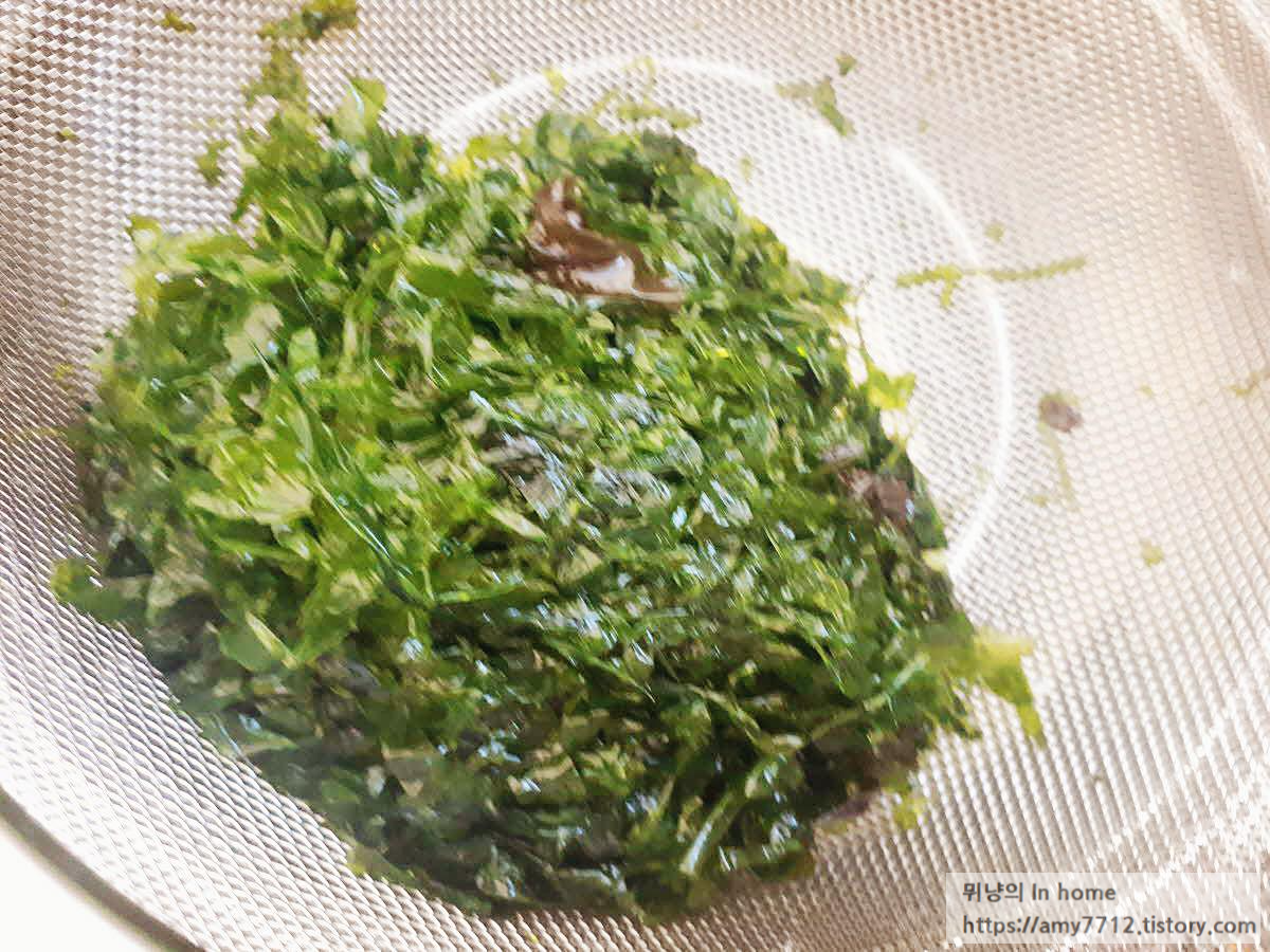 세척한 파래는 채반에 담아 꾸욱 눌러서 물기를 빼요.