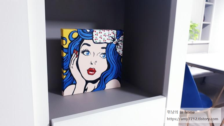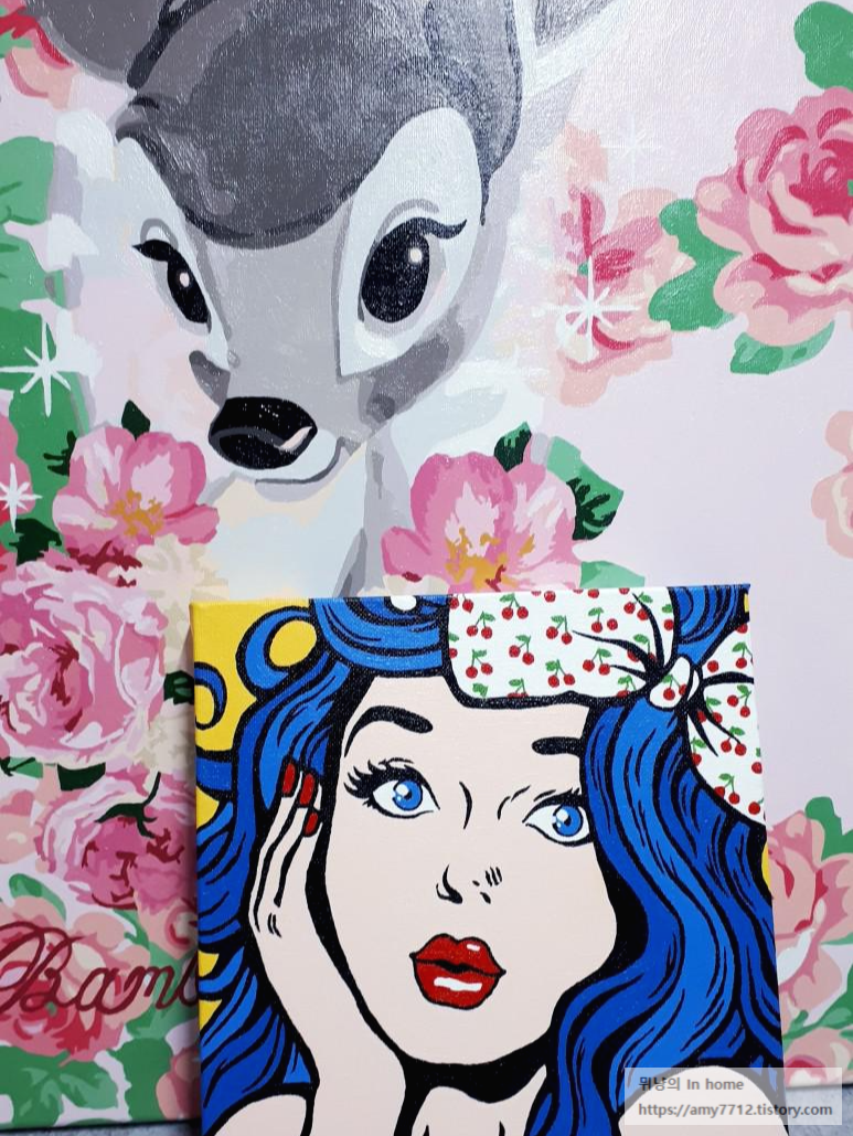 첫 번째 피포 페인팅 꽃밤비와 함께 찍어보았어요. 꽃밤비가 샤랑 샤랑 한 느낌이라면, 파랑머리 소녀는 강렬한 포인트가 있습니다. 둘 다 나름의 매력이 있으므로, 어울리는 장소에 각각 배치해두면 포인트 인테리어가 된답니다.
