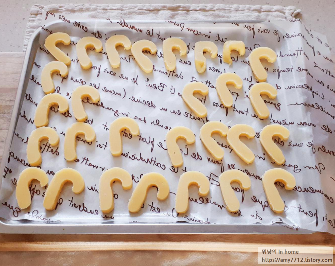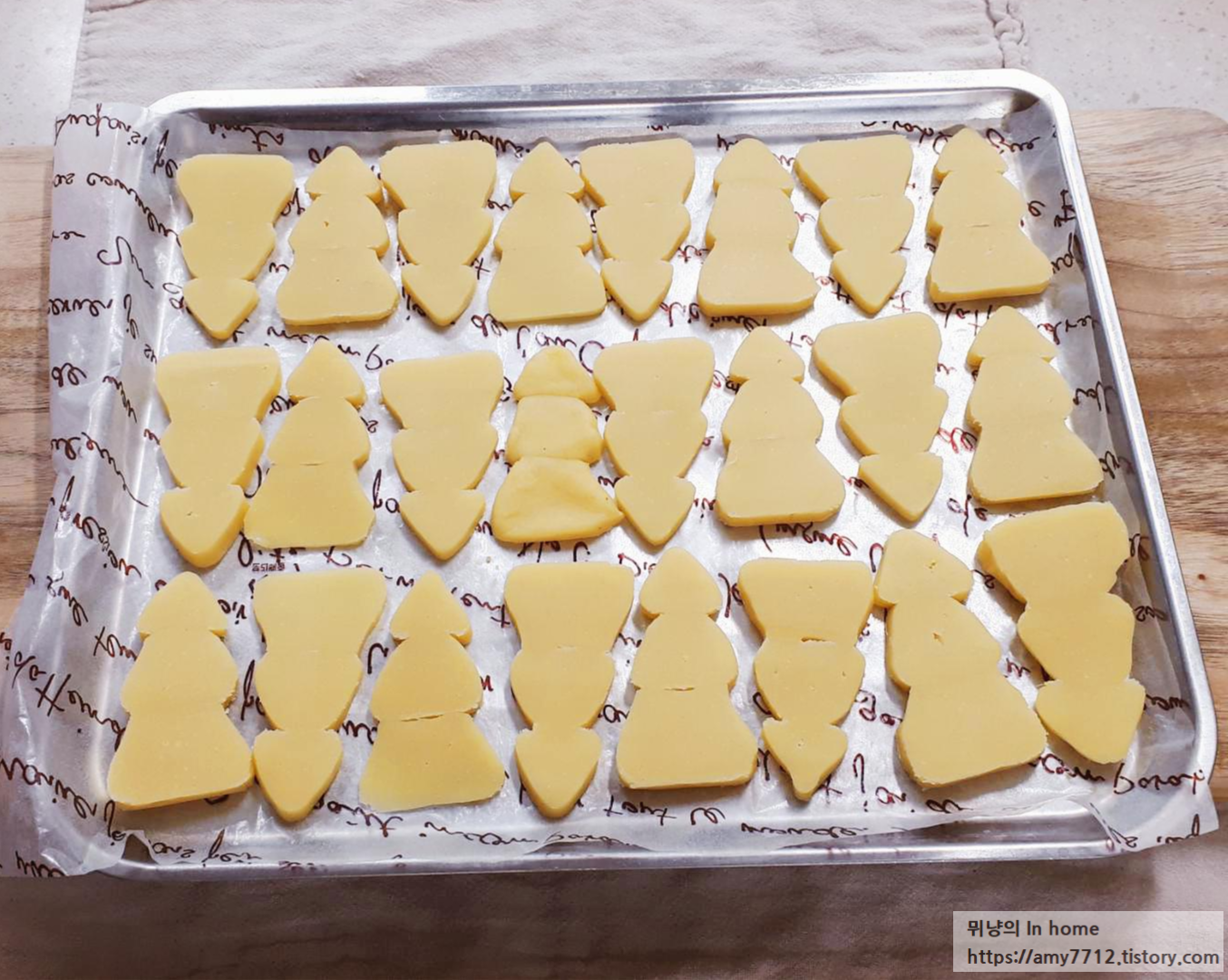 굳힌 반죽을 잘라서 유산지를 깔은 팬 위에 올립니다.