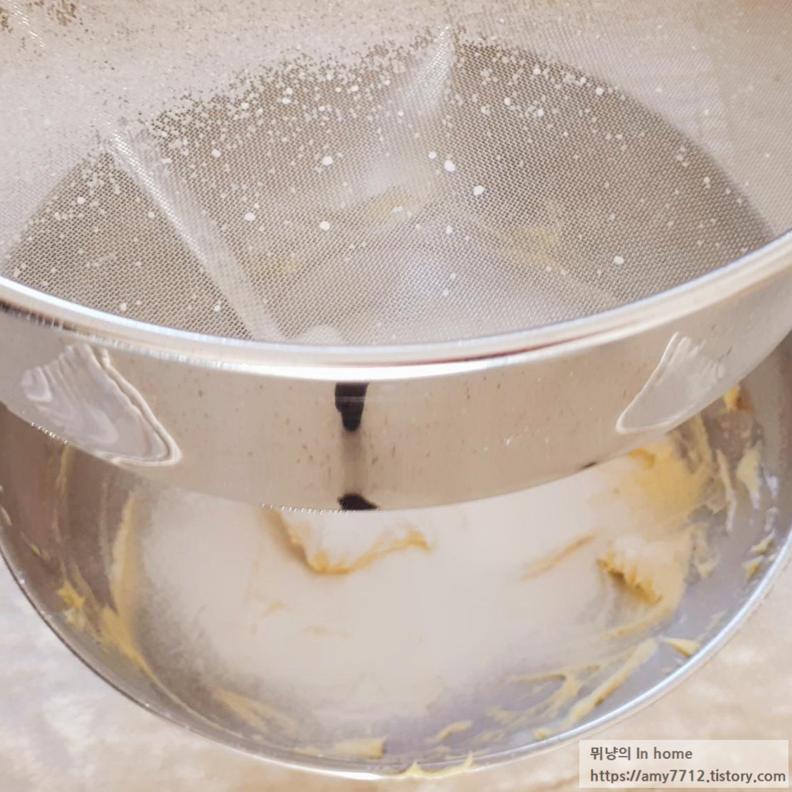 슈가파우더 60g을 체에 내려서 가루가 보이지 않도록 잘 섞어줍니다. 계란 30g 소금 한 꼬집을 넣어 잘 섞어줍니다.