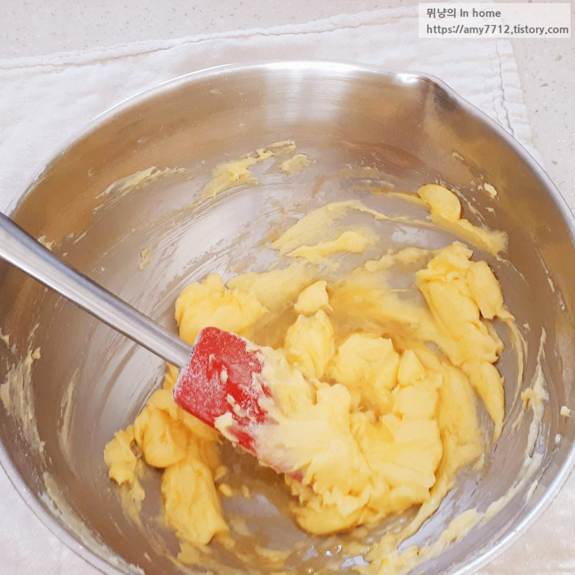 상온에 둔 무염 버터 100g을 크림 상태가 될 때까지 주걱으로 저어줍니다.